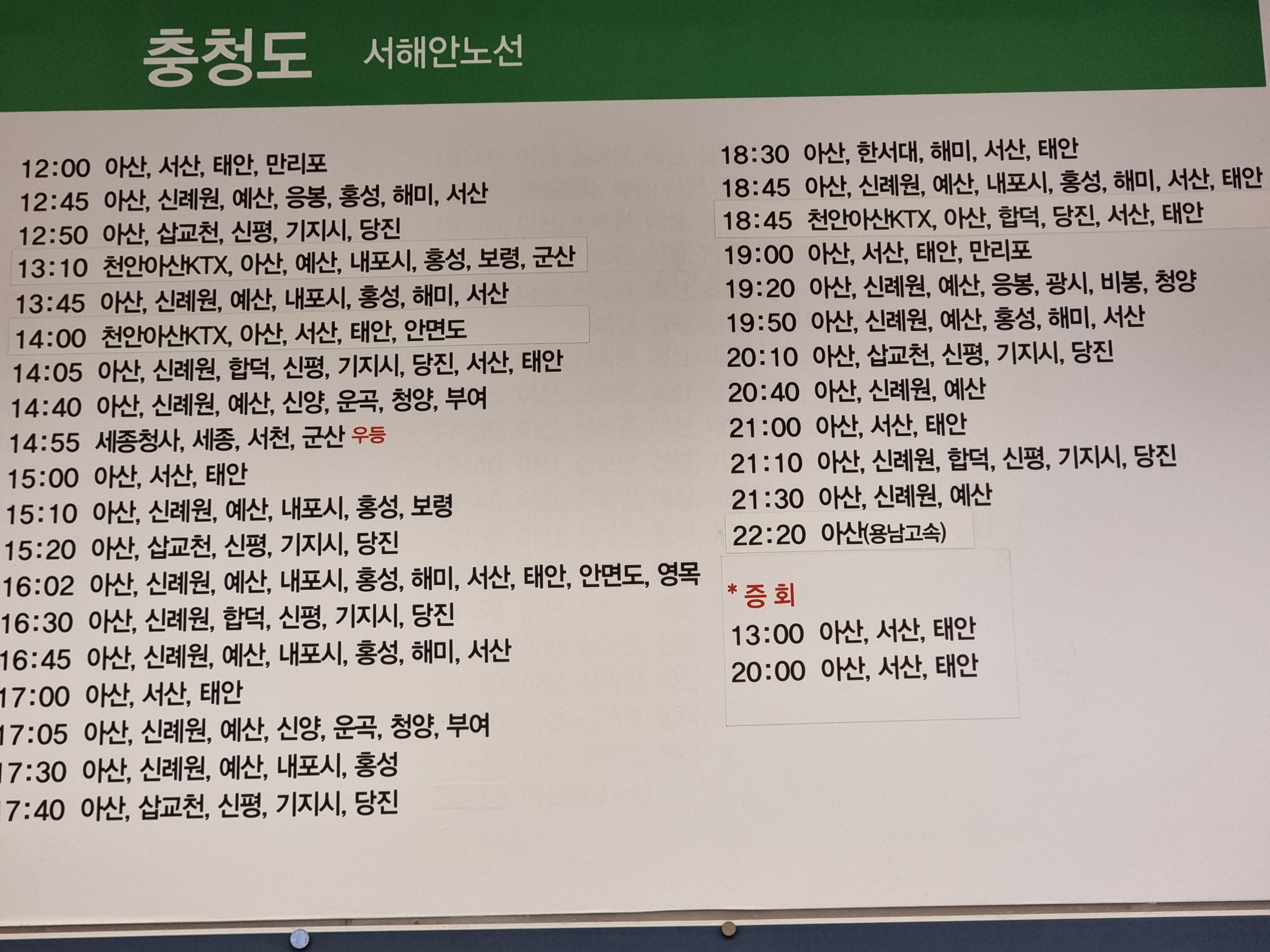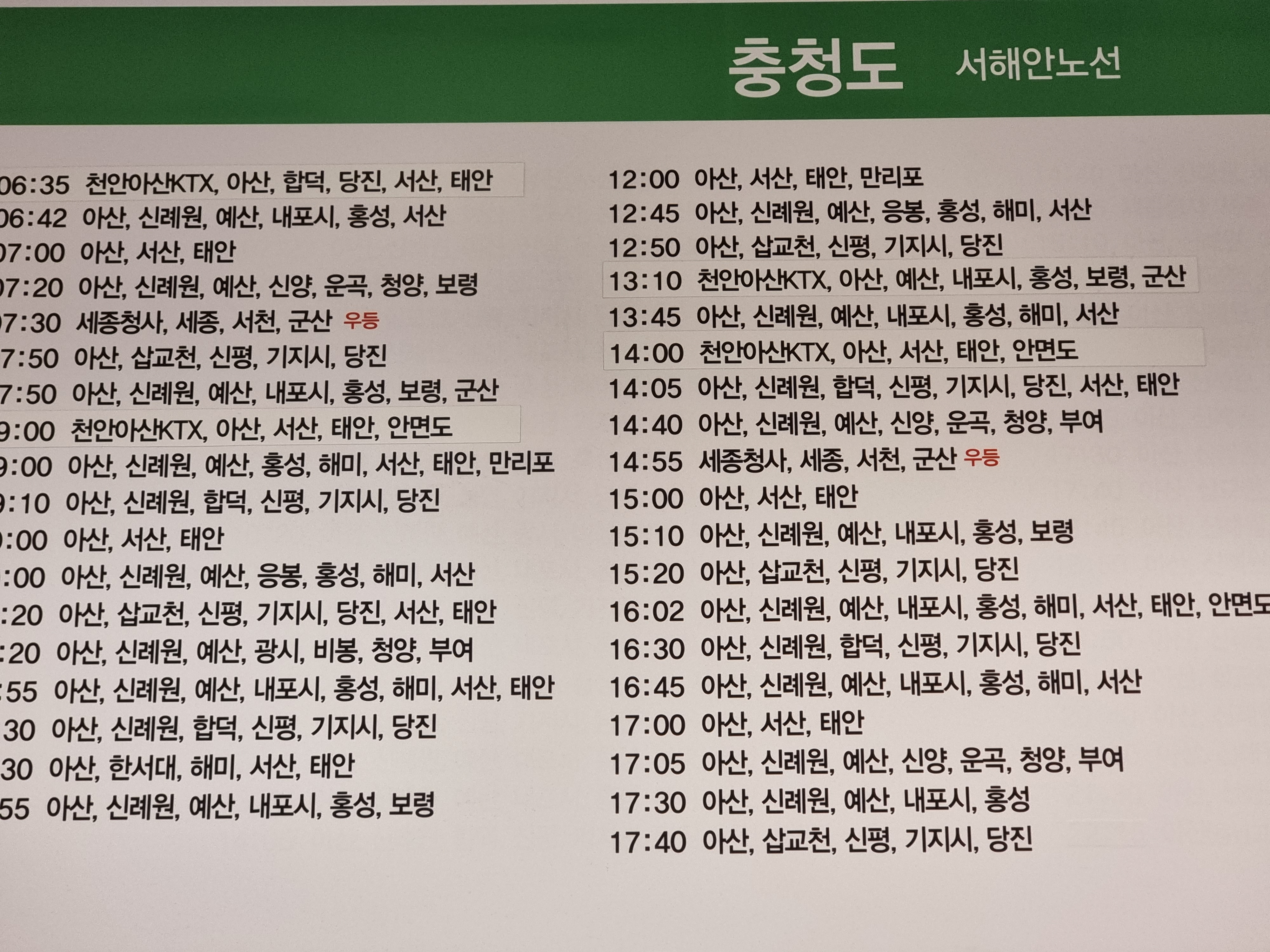 09시 천안아산KTX,아산,서산,태안,안면도 방면이 운행.