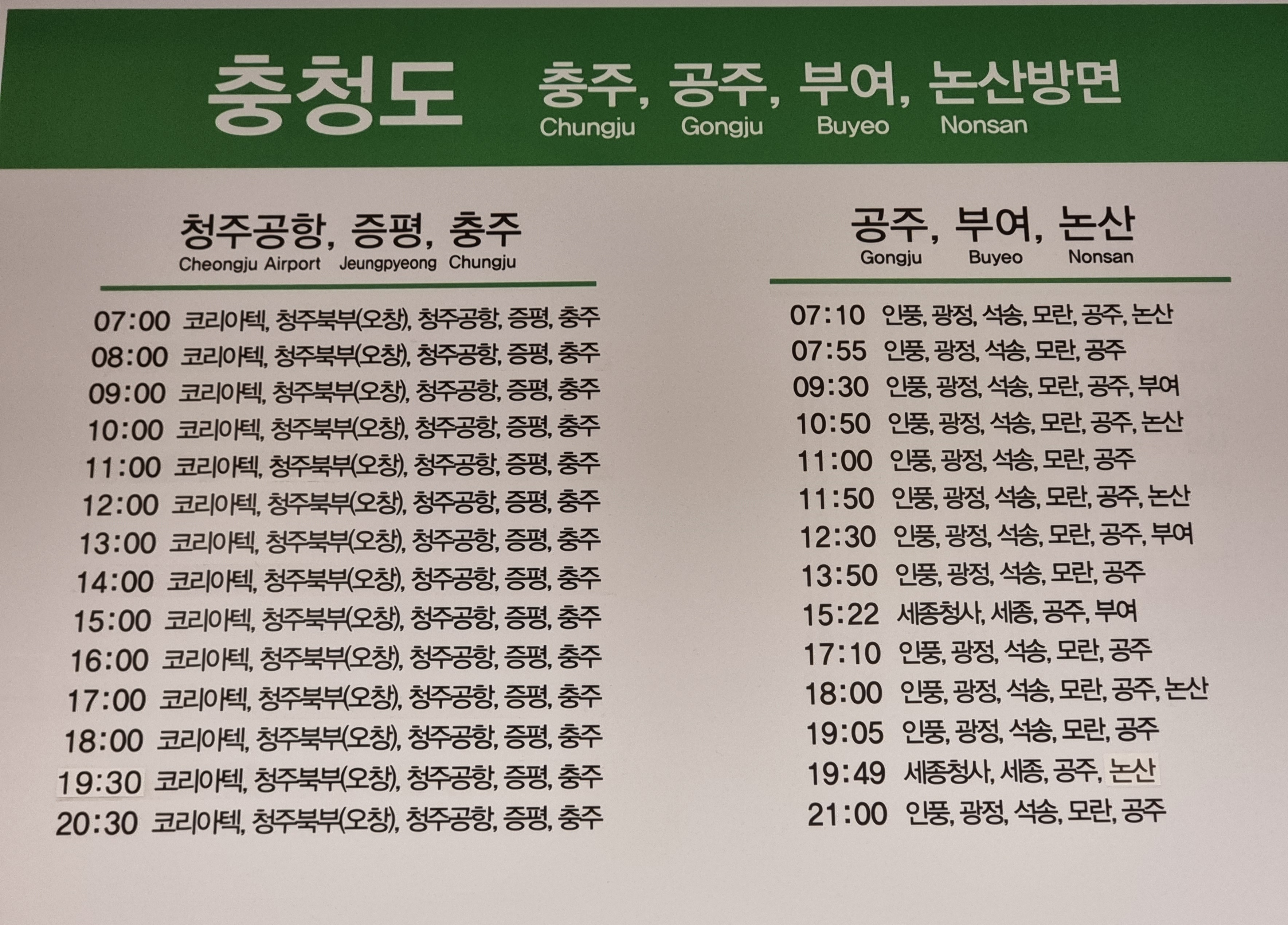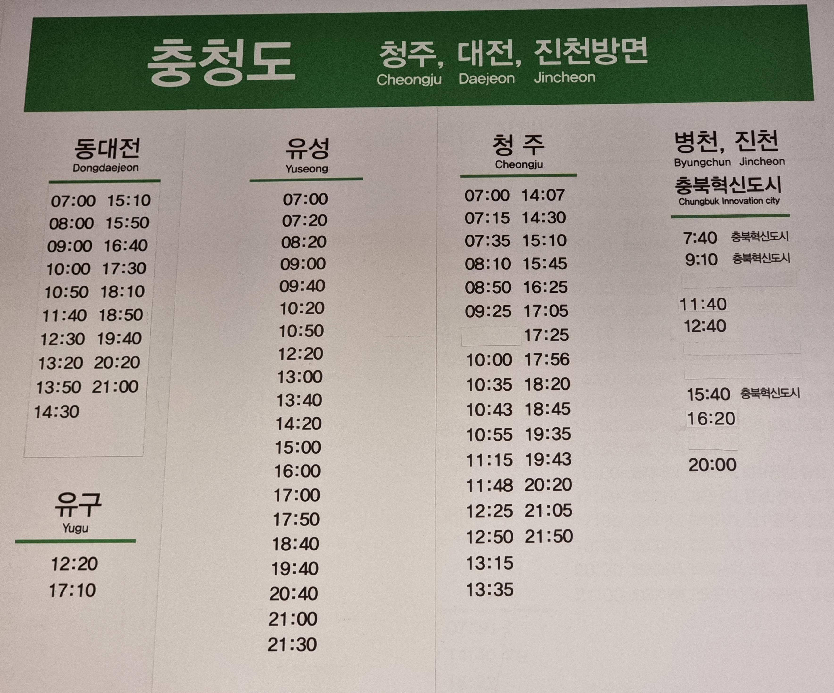 코리아텍,청주북부(오창),청주공항,증평,충주가는 버스 첫차는 07시 10분에 있고 막차는 20시 30분에 운행한다.