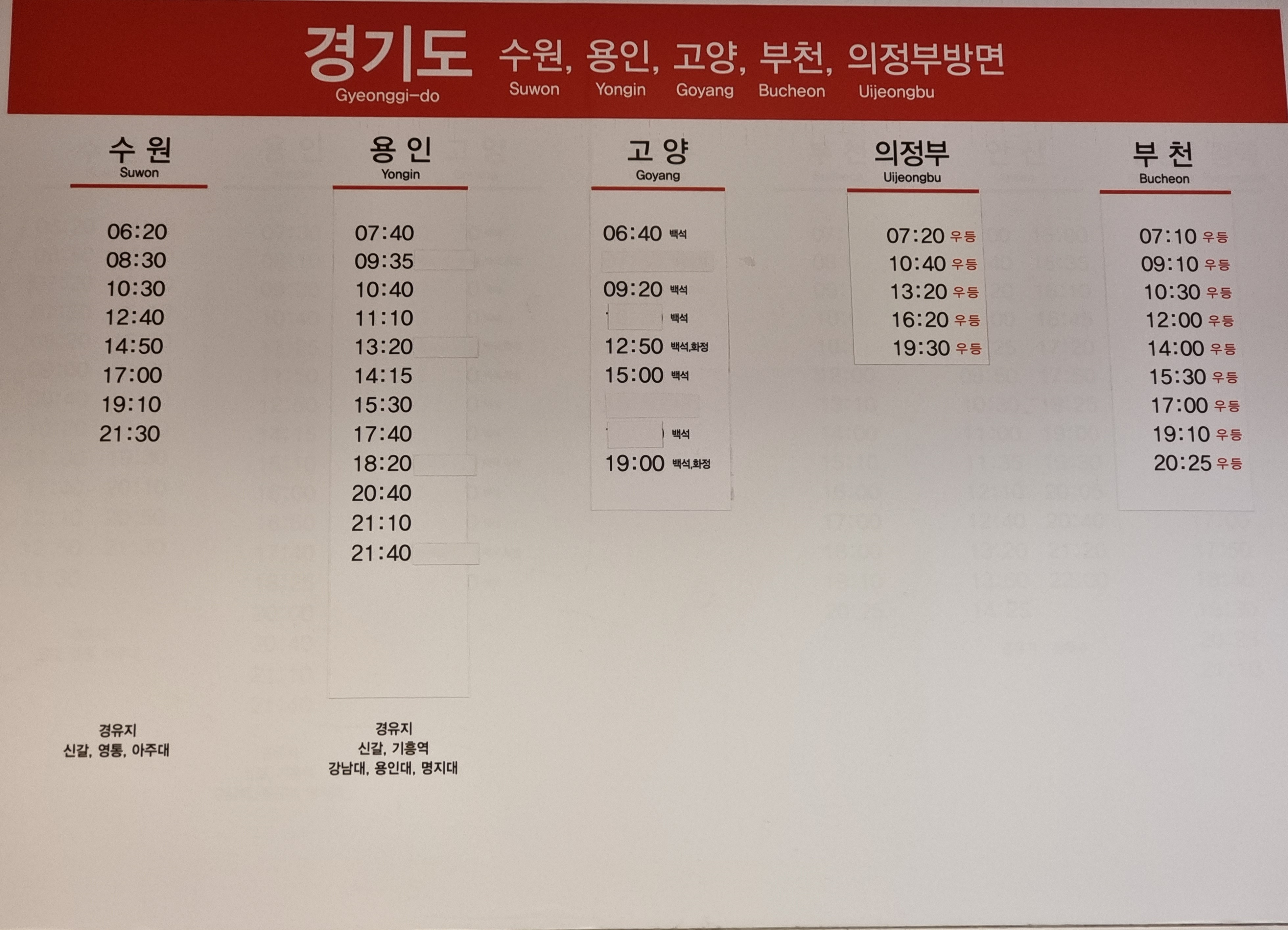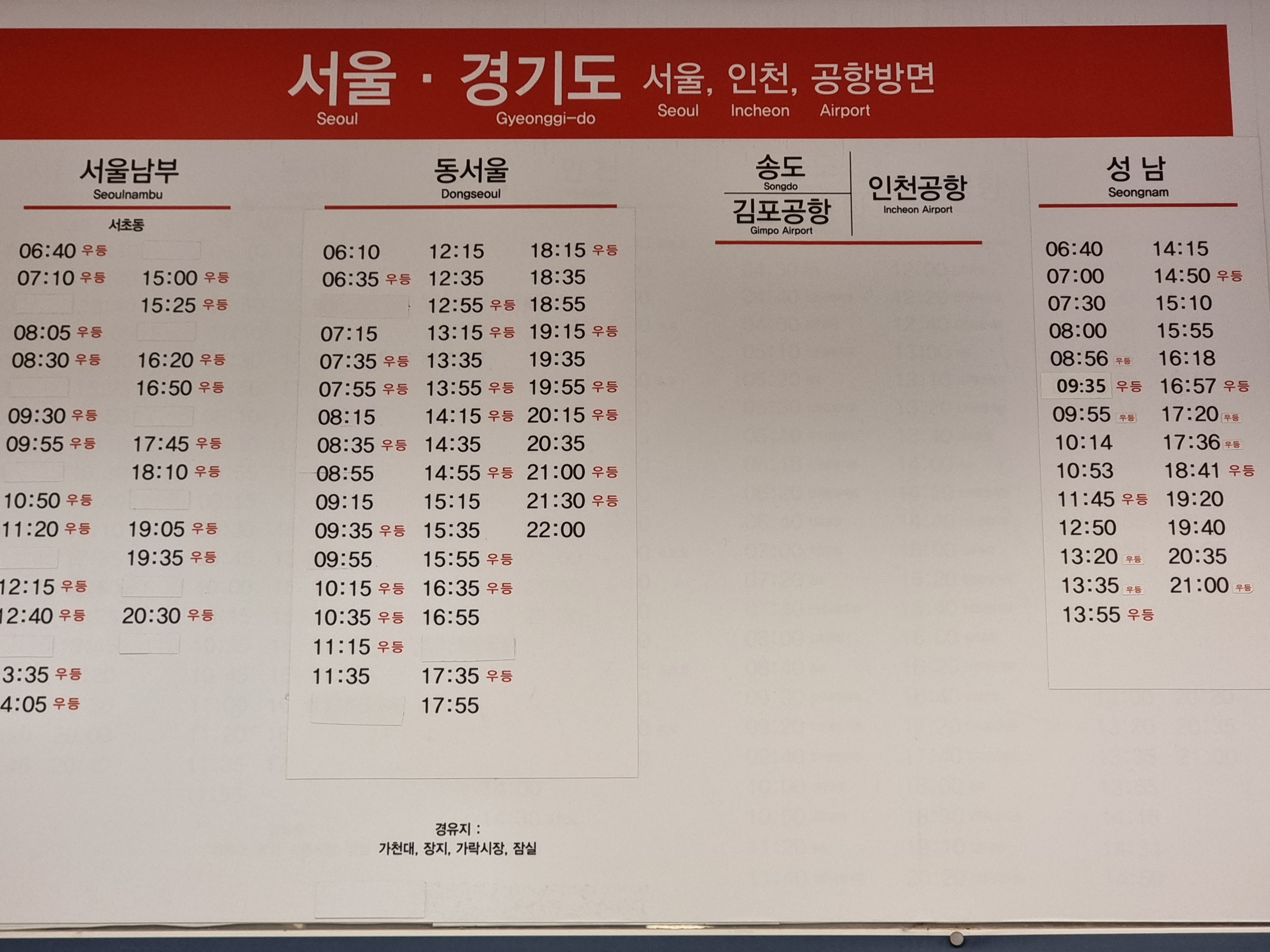 지금은 코로나 시국이라 일부 노선이 감차되거나 운행이 정지 될 수 있으므로 출발전에 다시 한번 시간표를 확인 하여야 한다.