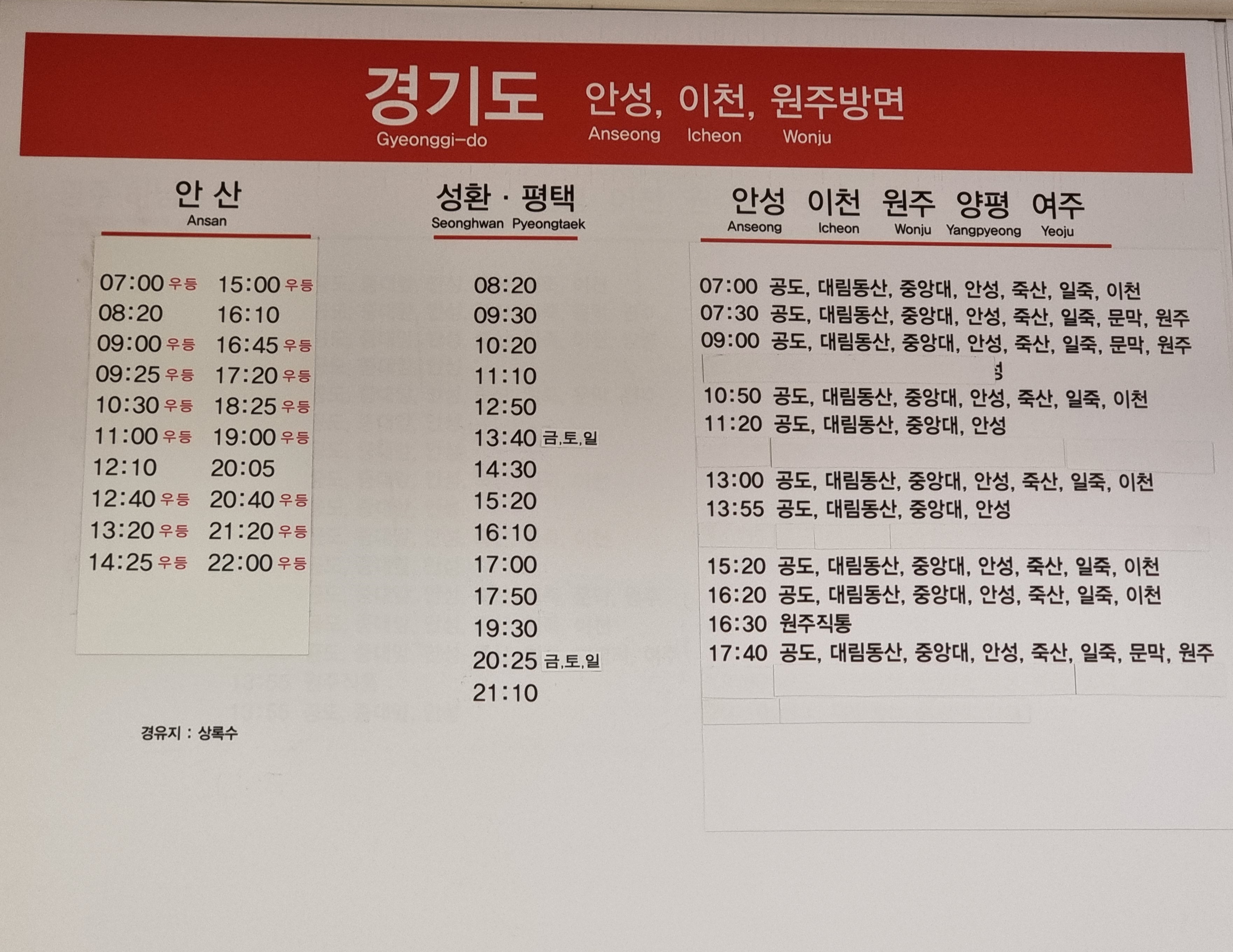 그리고 공도,대림동산,중앙대,안성,죽산,일죽,이천가는 시외버스는 첫차가 07시에 운행된다.