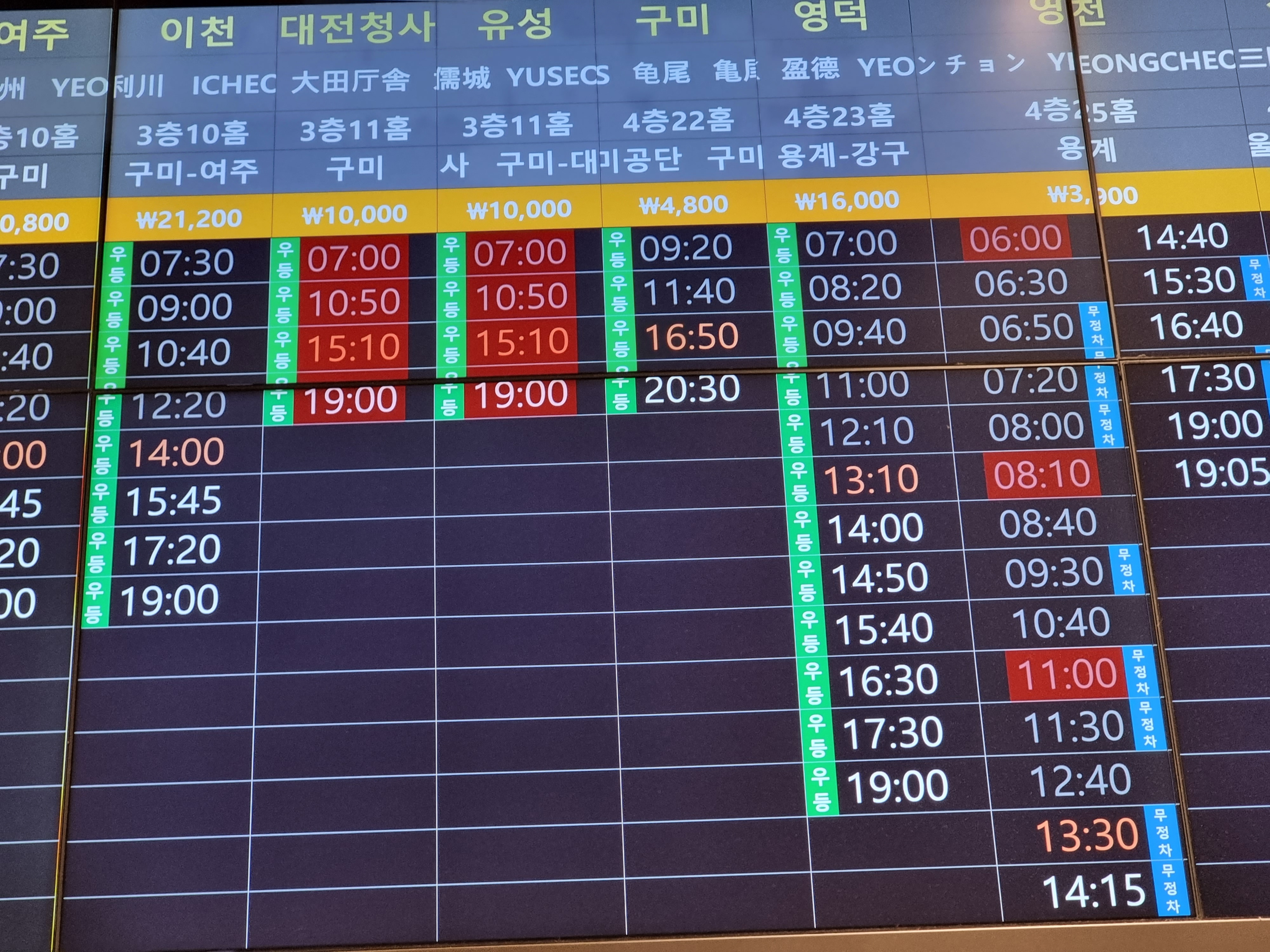 동대구 터미널에서 평택가는 버스는 하루에 3편이 운행되는데 막차는 18시에 동대구를 출발한다.