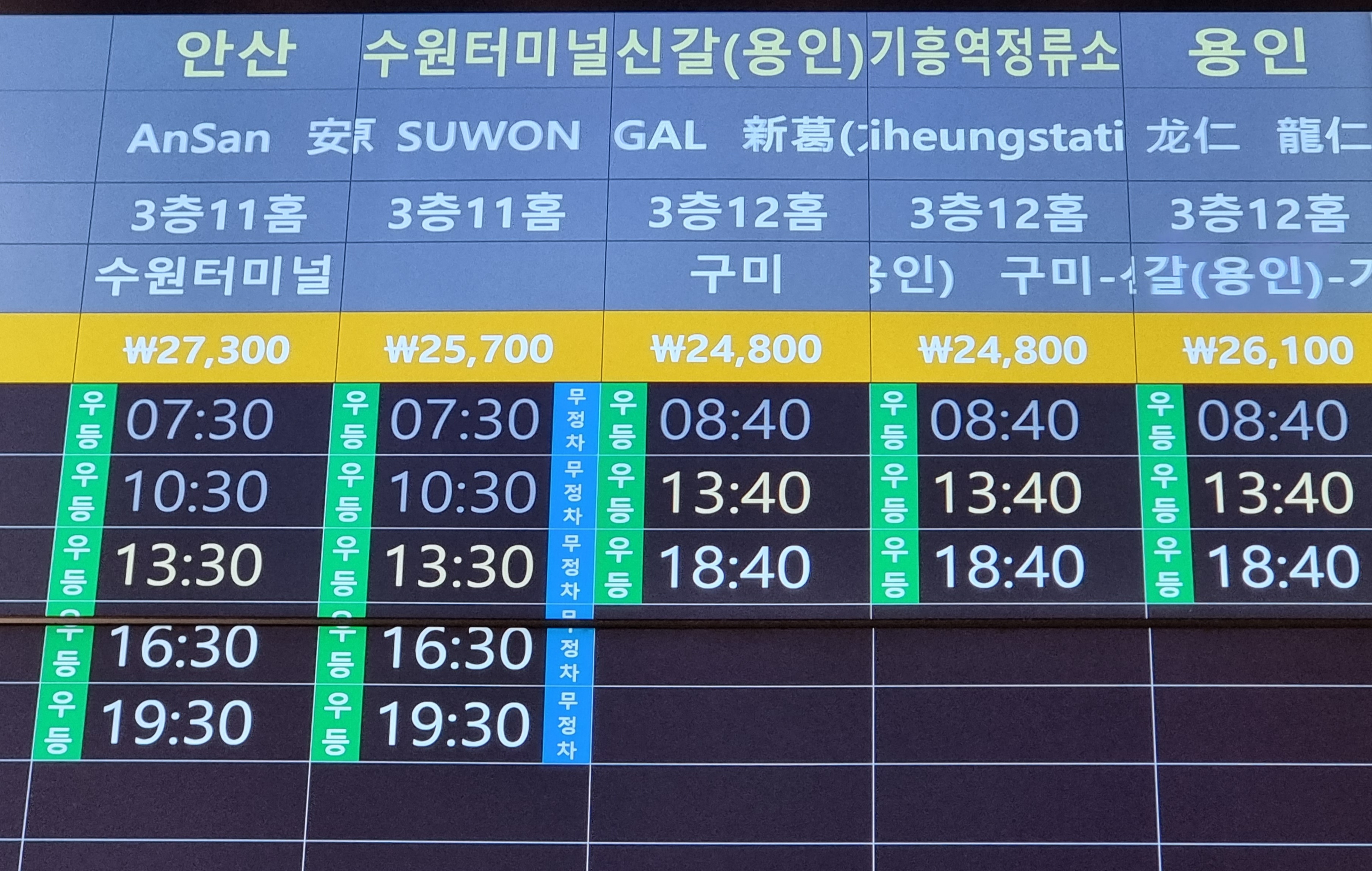 동대구 터미널에서 수원터미널 가는 버스는 하루에 5편이 운행되고 막차는 19시 30분에 운행한다.