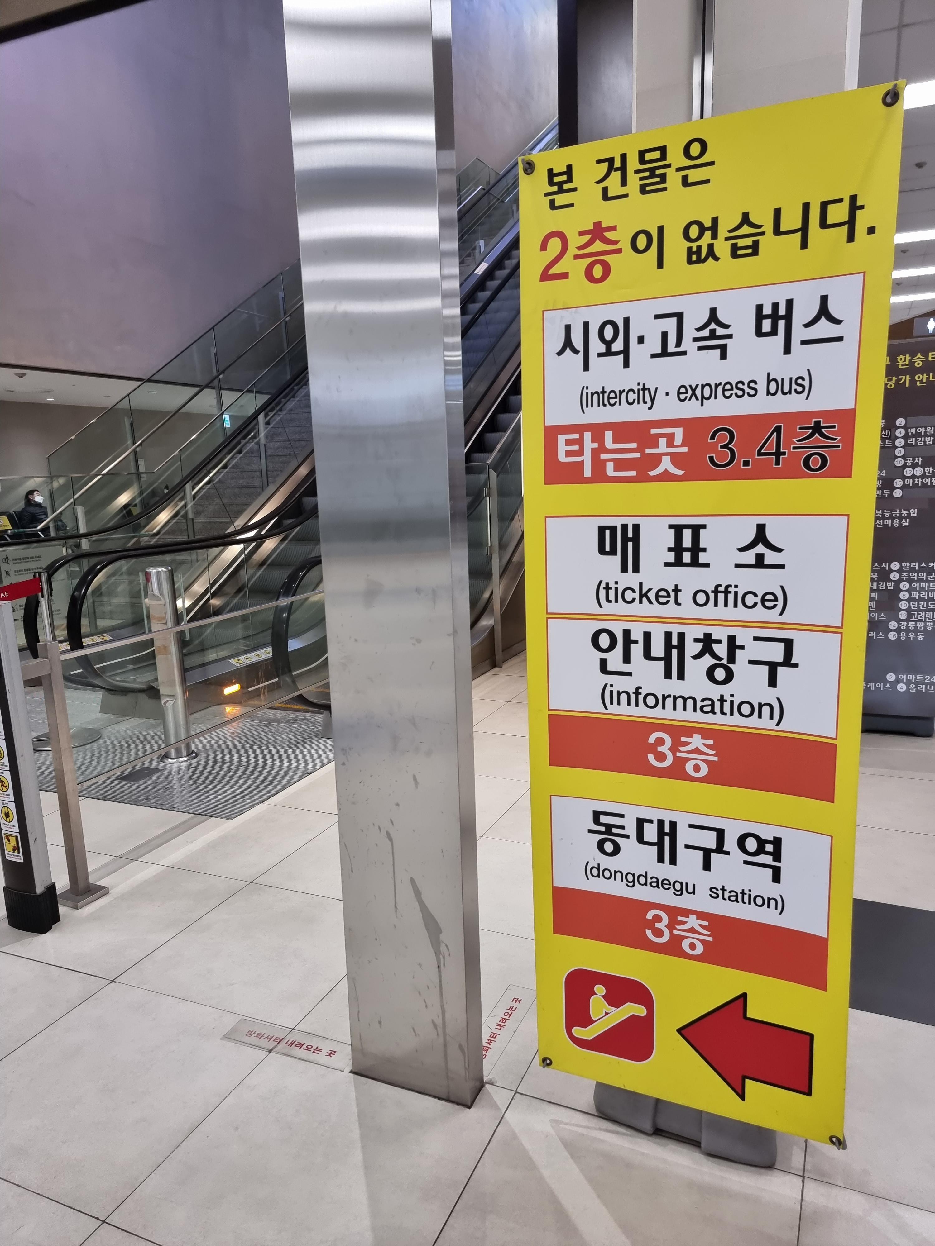 입구를 통해 3층으로 에스컬레이터로 이동하게 되면 3층에 동대구 터미널 매표소가 위치하고 있고 시외버스와 고속버스 탑승은 3층과 4층에서 탑승할 수 있다.