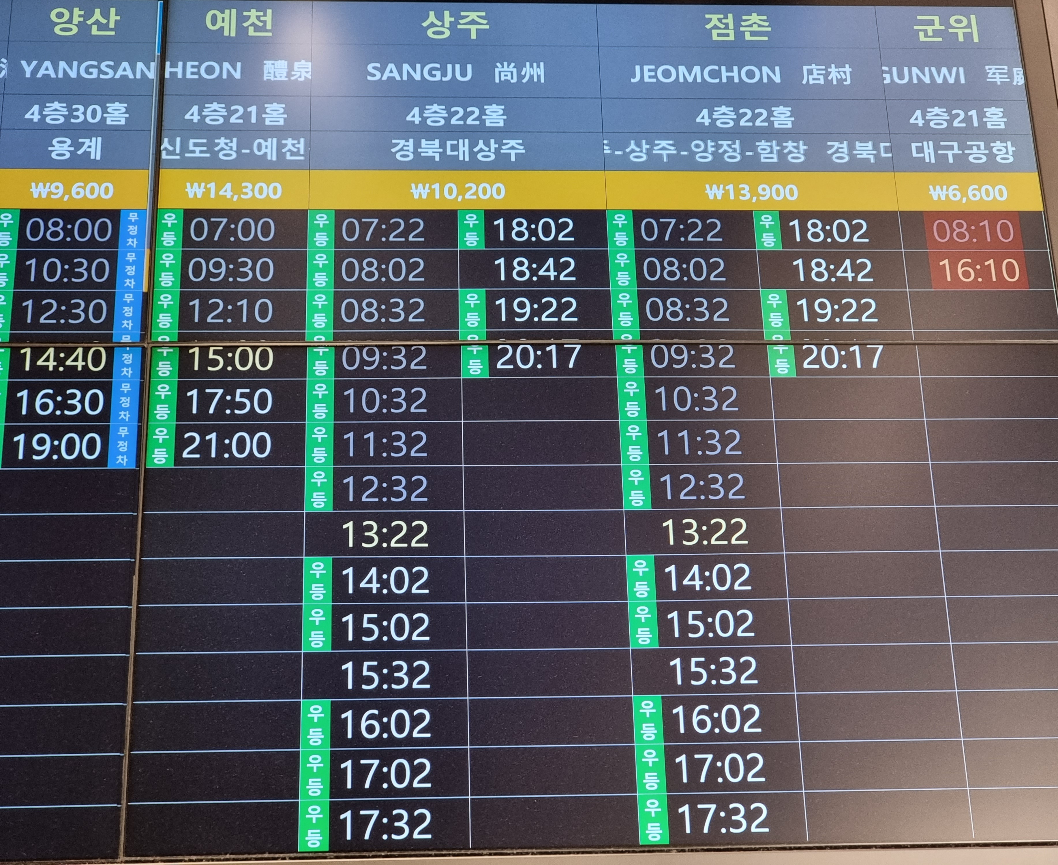 동대구 터미널에서 상동에 있는 소풍터미널 가는 버스는 하루에 3회 운행되는데 시간은 08시30분,10시,16시에 운행된다.요금은 36,600원이고 탑승 승차장은 3층 11번 홈이다.