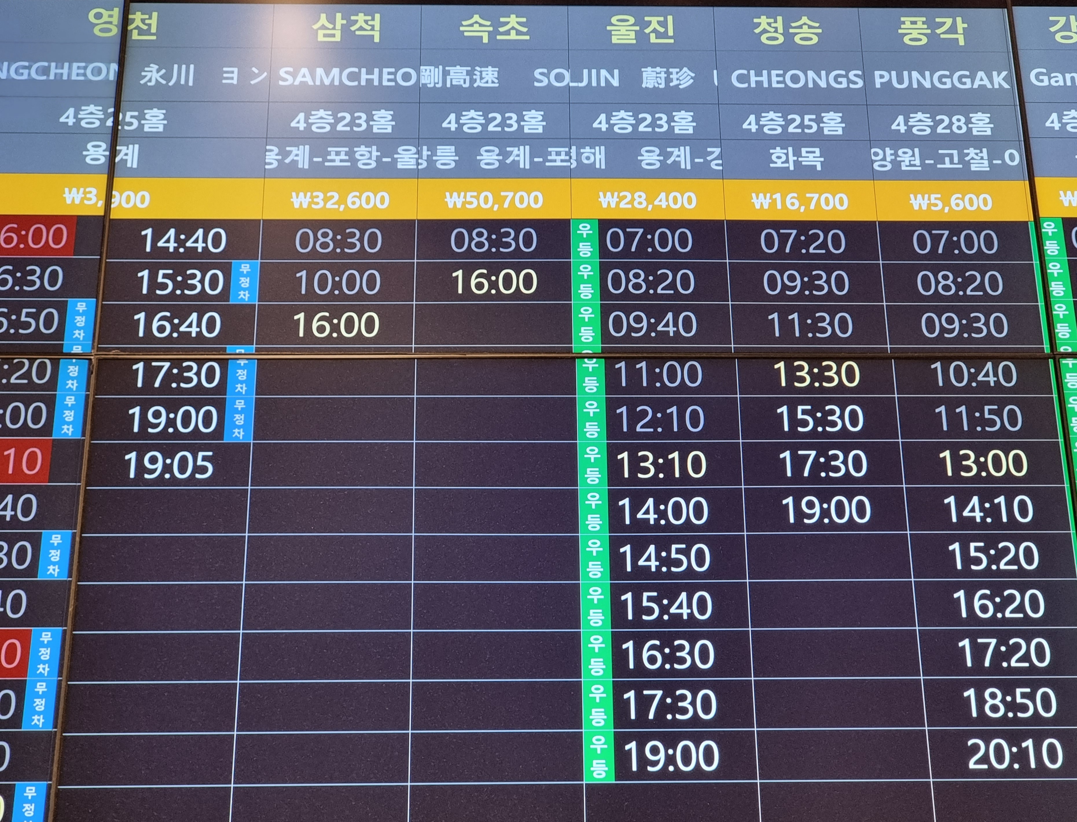 동대구 터미널에서 강릉가는 버스는 하루에 3편 08시30분,10시,16시에 운행된다.