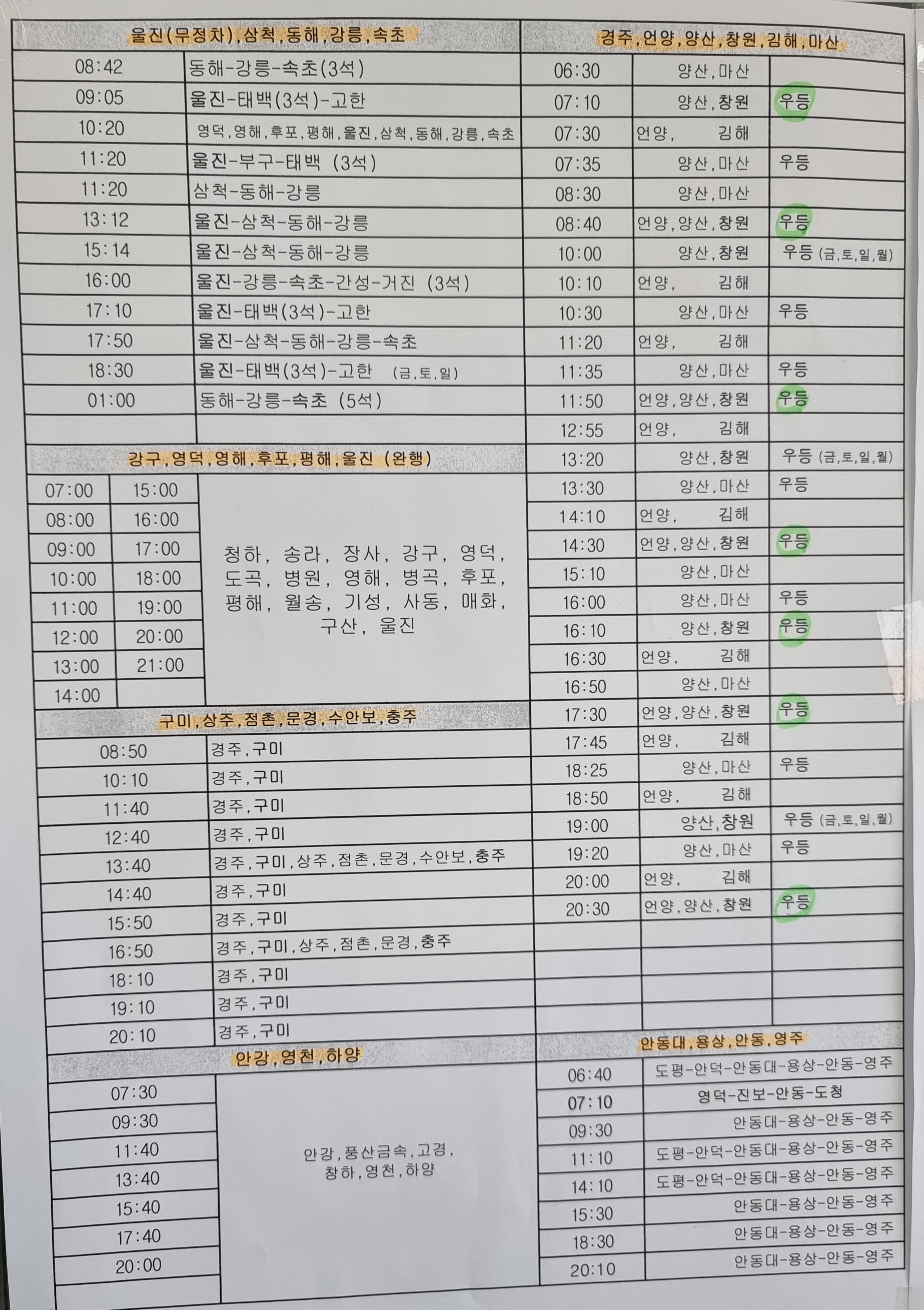 -강구,영덕,영해,후포,평해,울진 방면 시간표