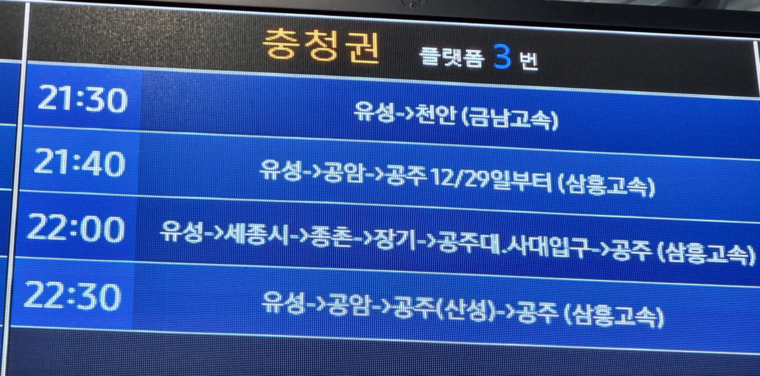 공주가는 막차는 유성에서 22시 30분에 유성시외버스터미널을 출발한다.