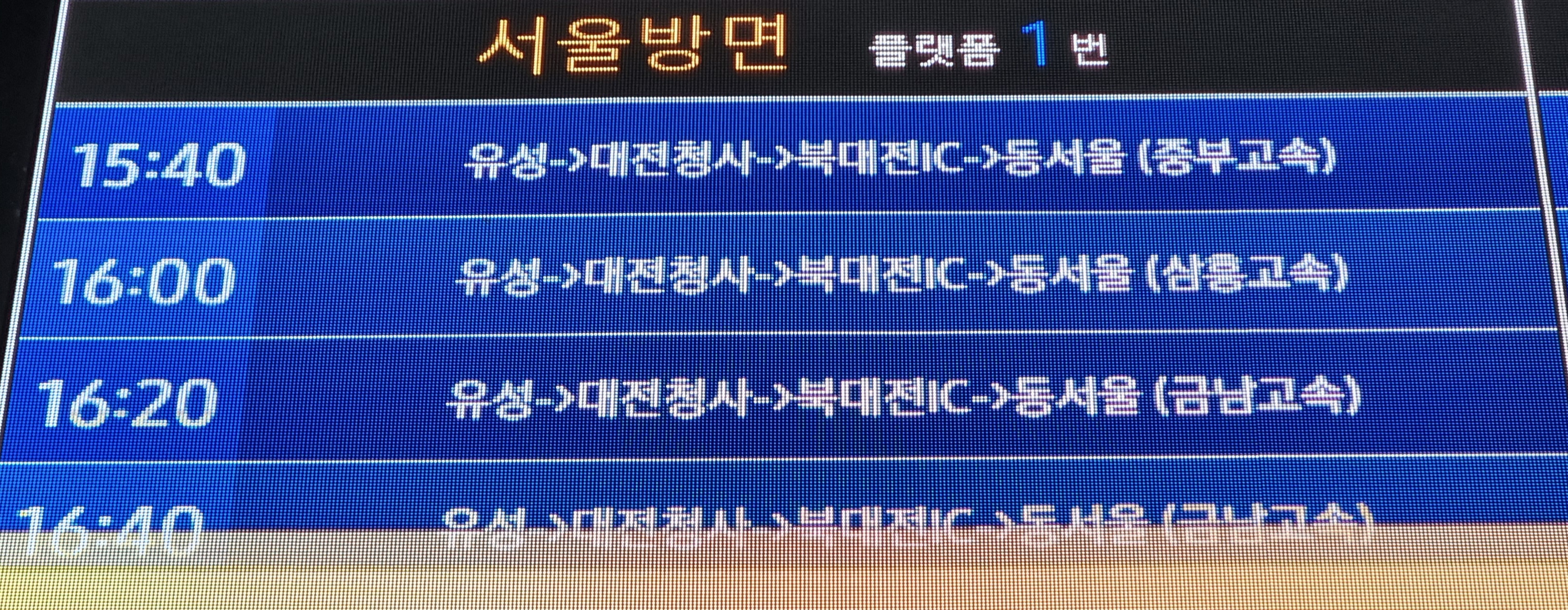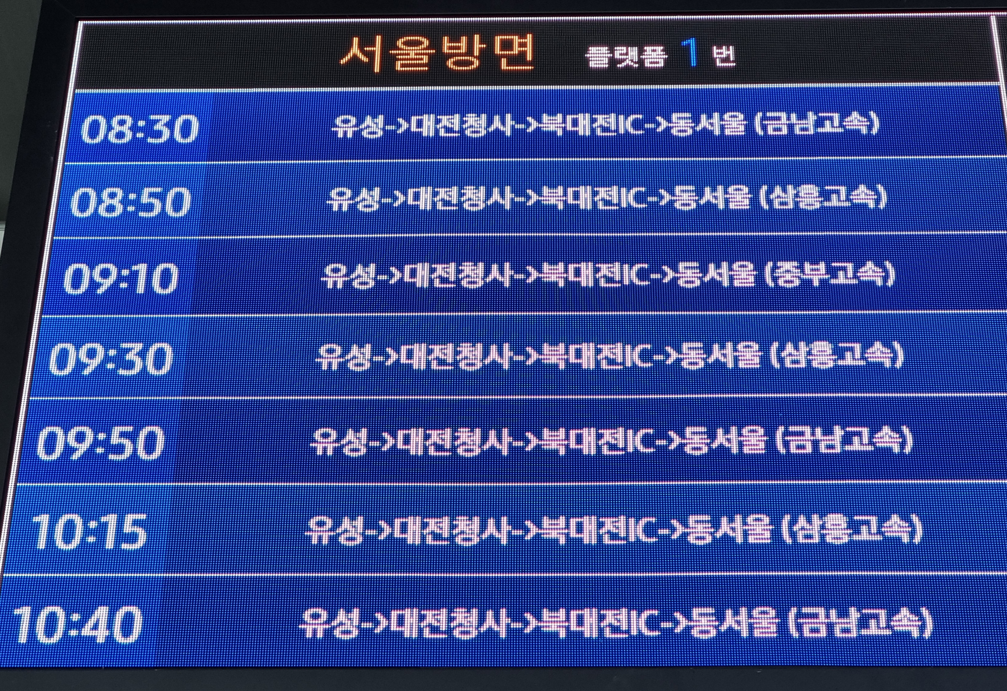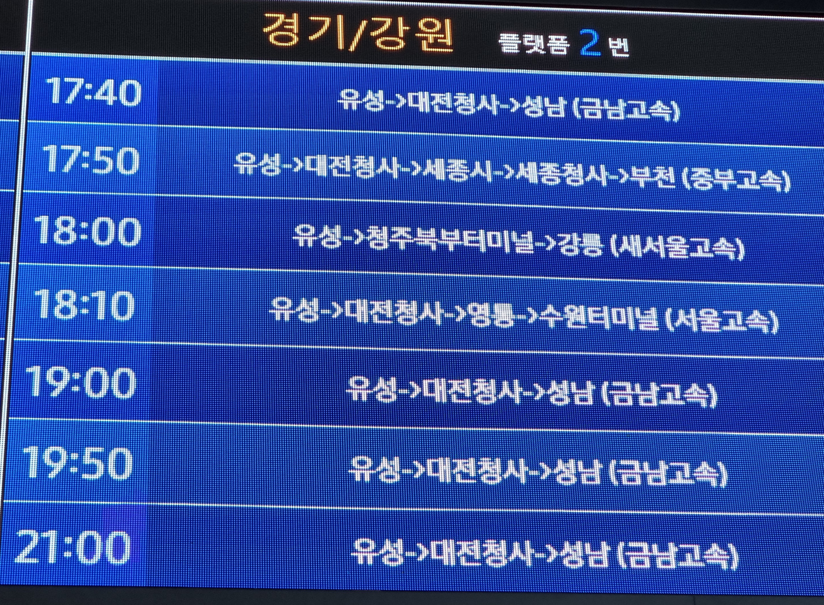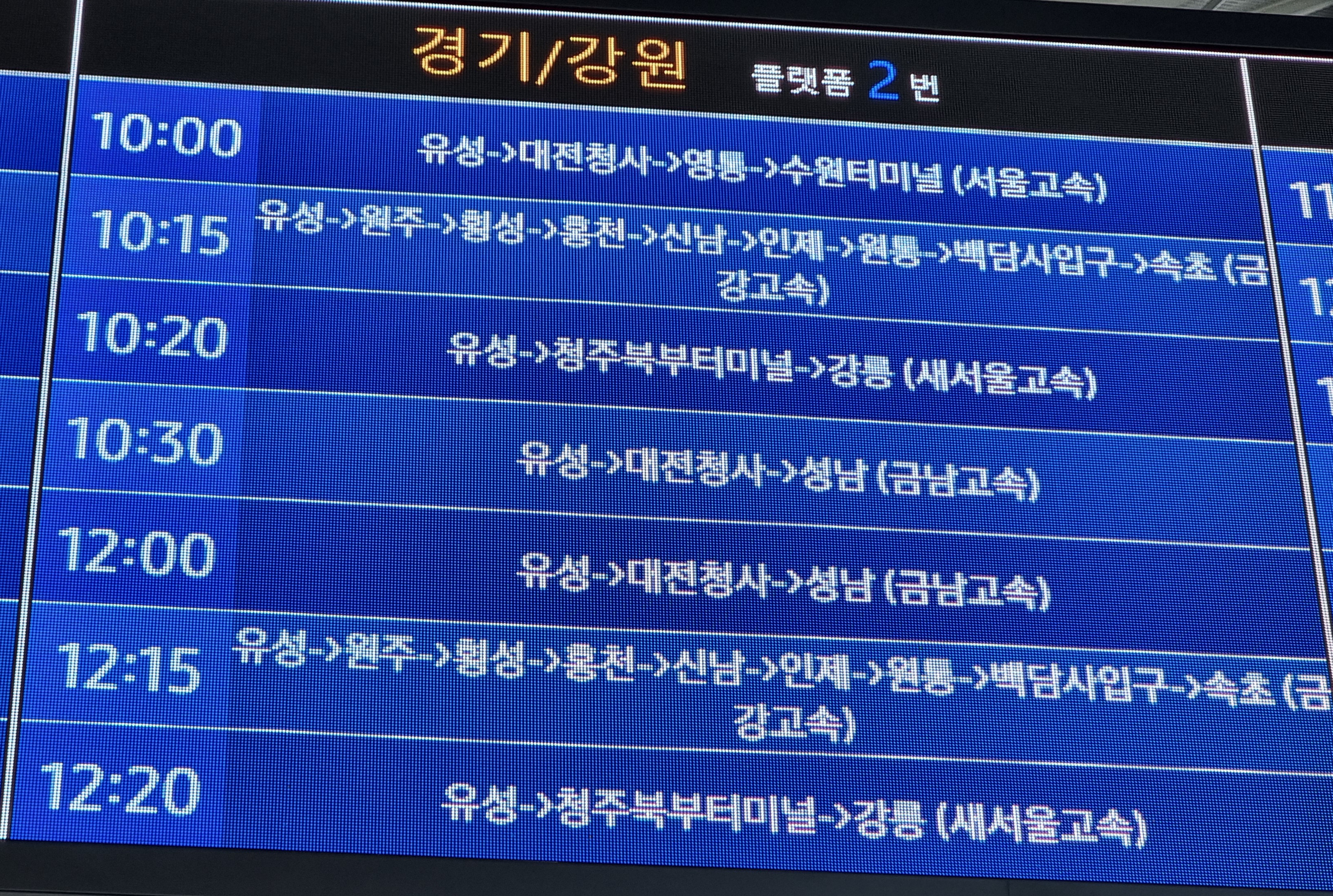 강릉방면은 10시에 유성시외버스터미널을 출발한다.탑승 승강장은 2번 홈이다.