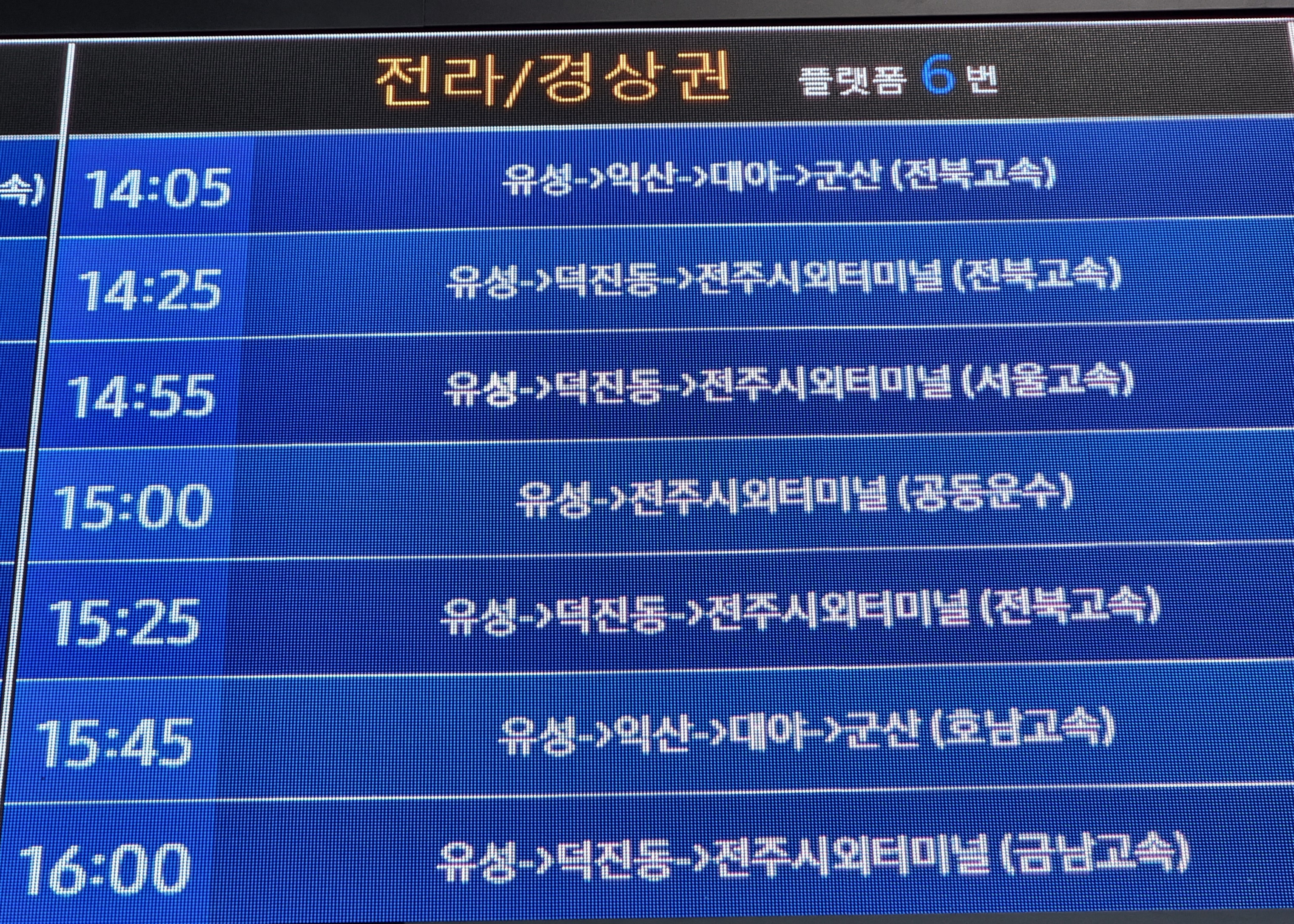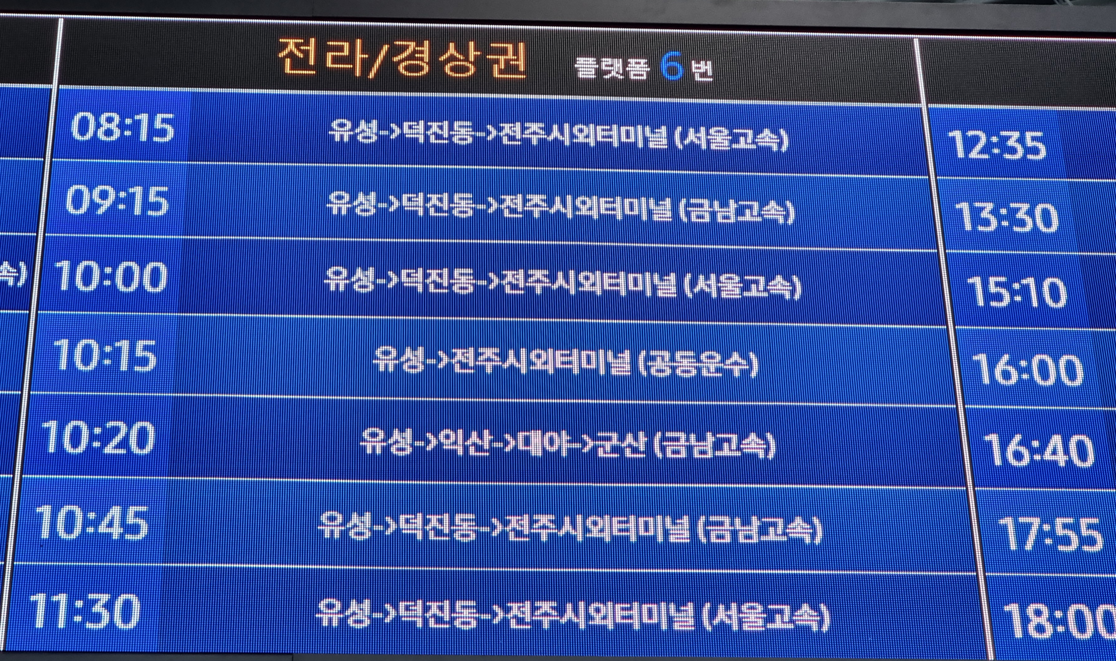유성터미널에서 전주가는 시외버스는 08시 15분에 덕진동을 경유하여 운행된다.
