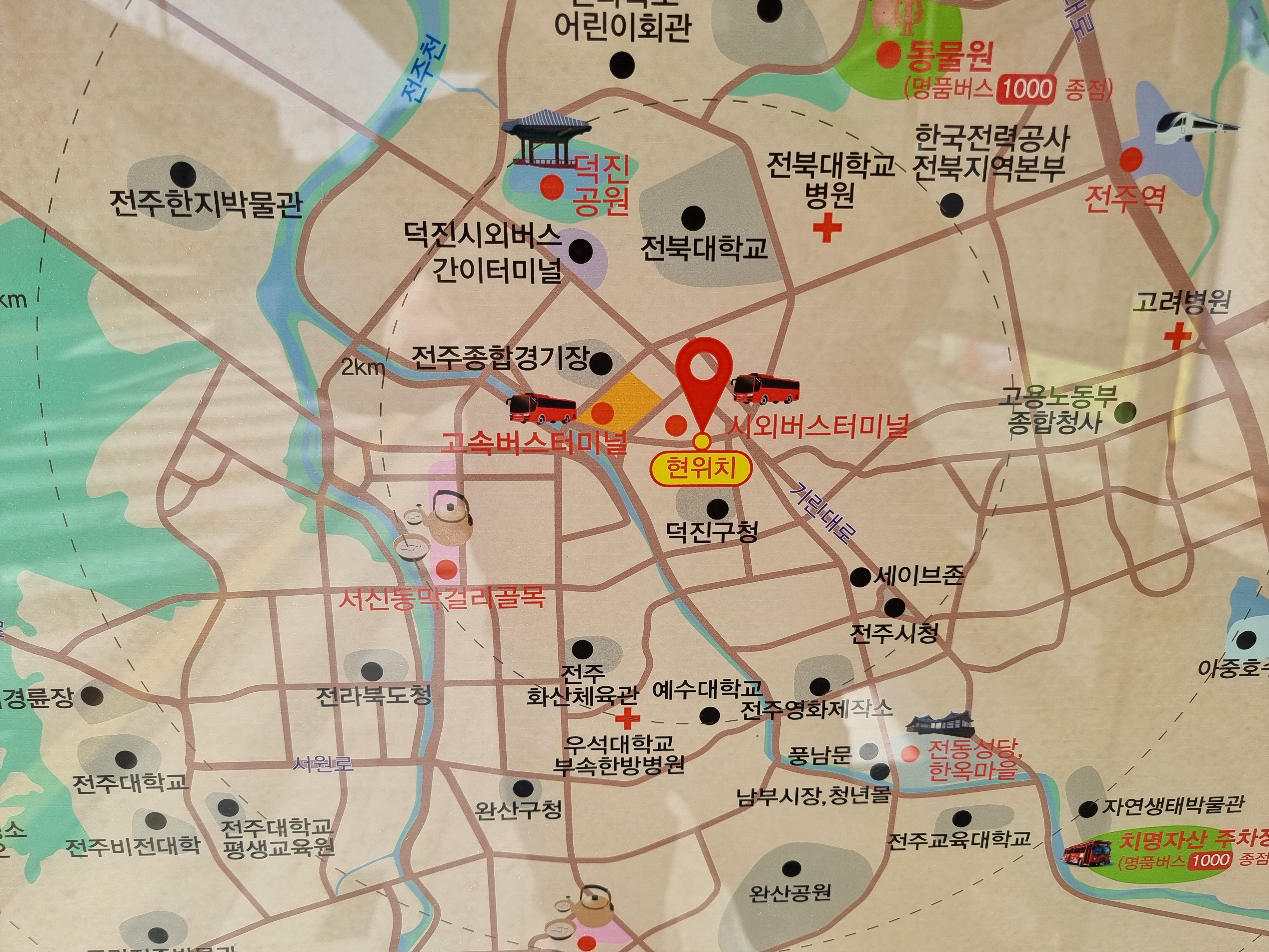 전주 시외버스터미널은 전주역에서 버스로 10분 거리에 위치하고 있고 전주고속터미널과의 거리는 약 300m 떨어져 있다.