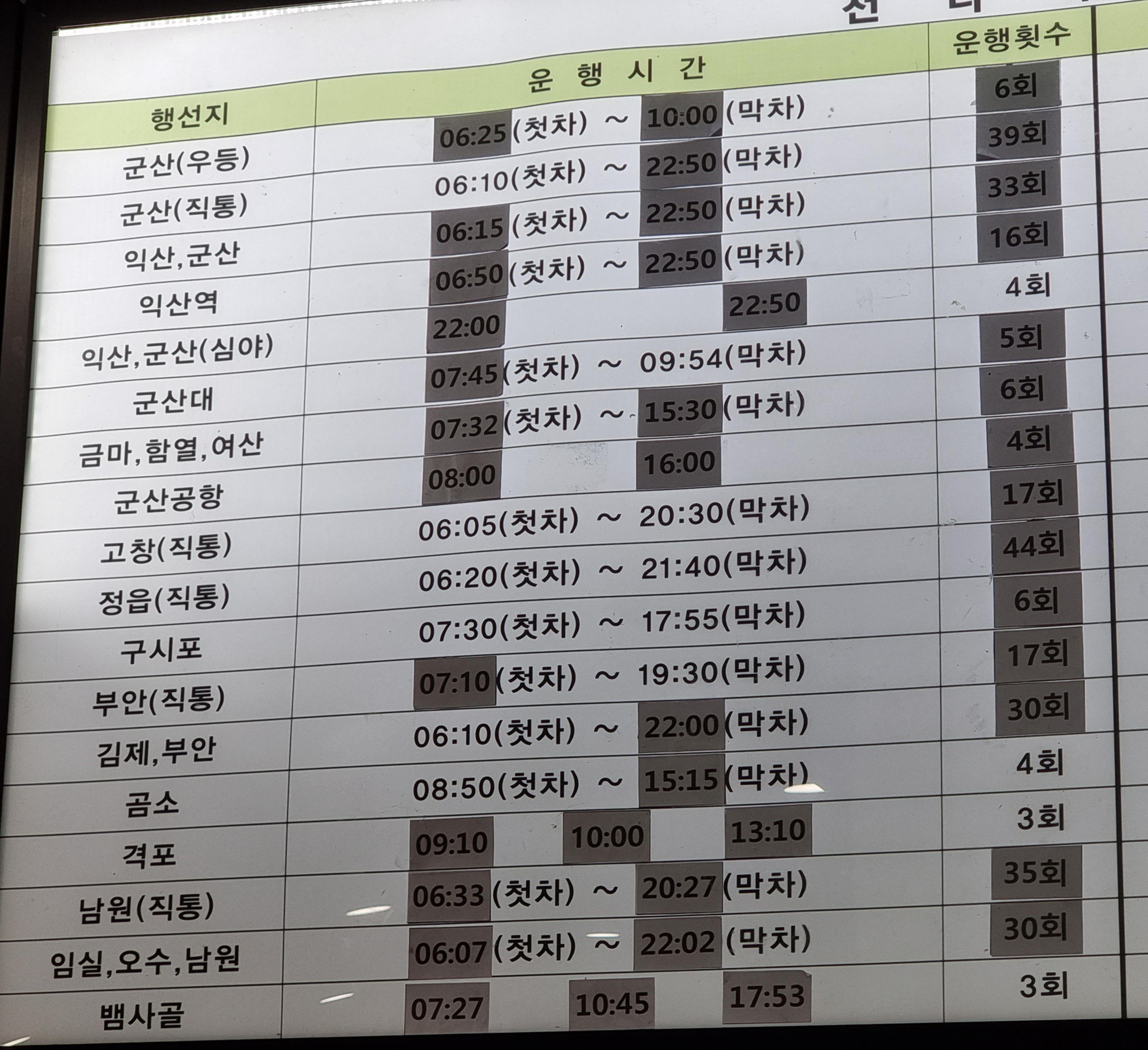 전주에서 군산가는 시외버스는 직통이 하루에 39회 운행되고 첫차는 06시10분,막차는 22시50분에 전주를 출발한다.