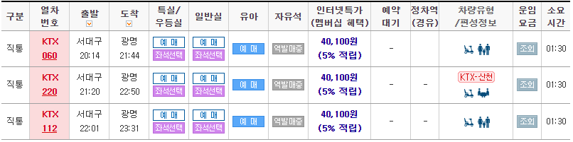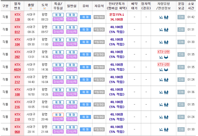 -광명방면 KTX시간표(서대구역→광명역)