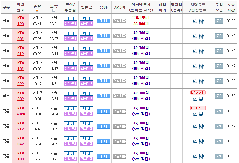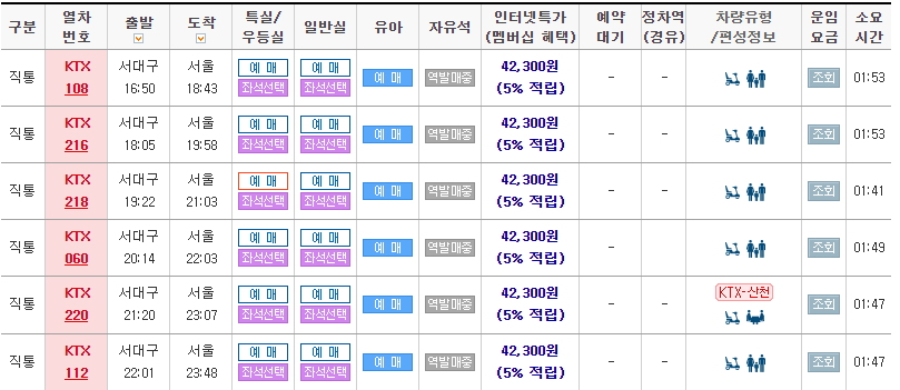 -서울역 방면 KTX시간표(서대구역→서울역)