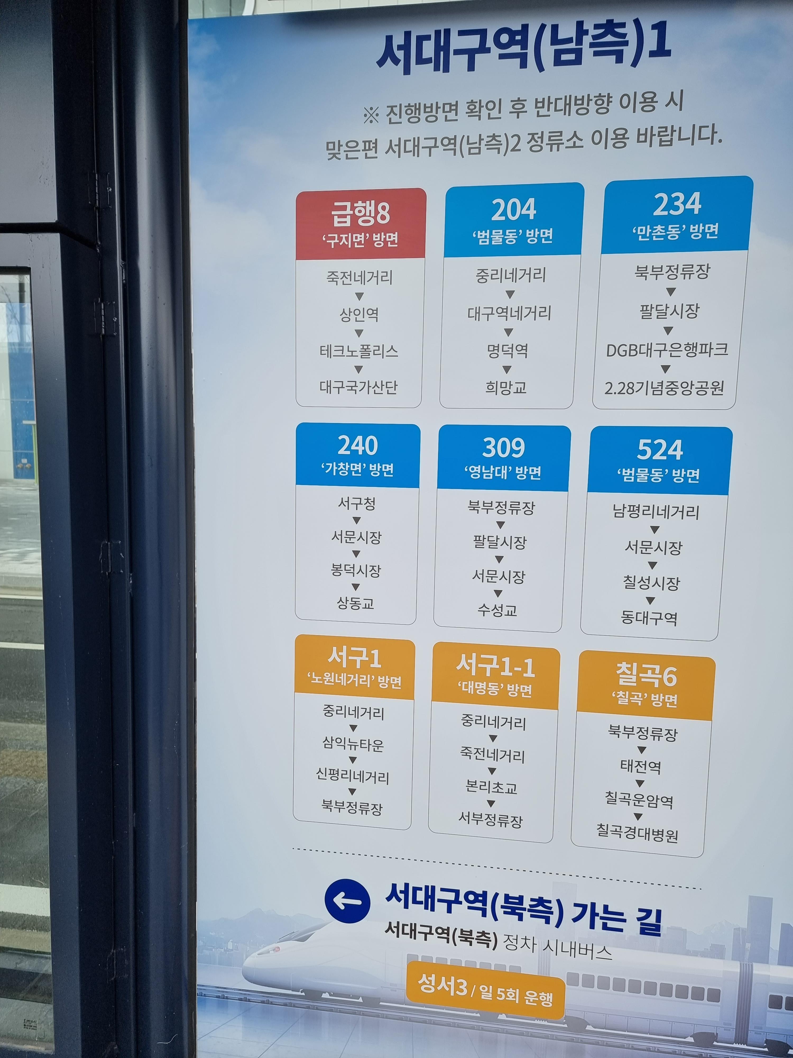 서대구역 남측방면 버스는 급행8,204번,234번,240번,309번 버스가 서대구역을 경유하여 운행한다.