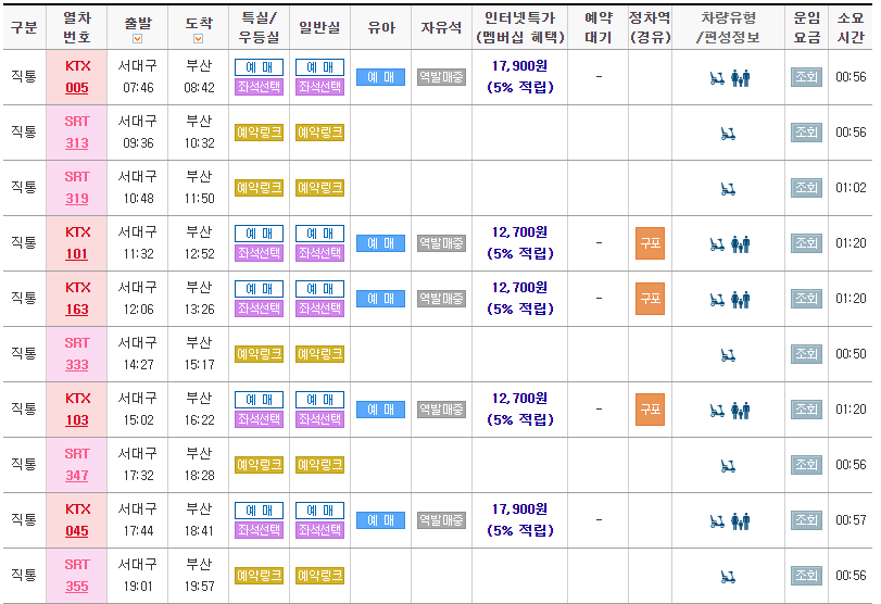 -부산방면 KTX 시간표(서대구역→부산역)