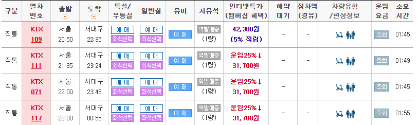 서울역에서 서대구역가는 KTX기차 막차는 23시에 출발하여 서대구역에는 00시55분에 도착한다.
