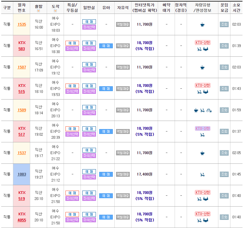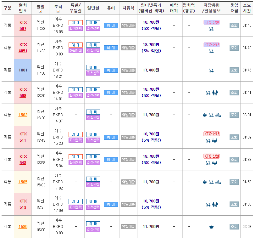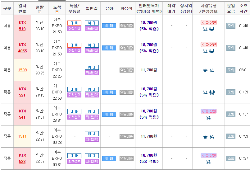 익산역에서 여수EXPO역 가는 막차는 KTX 기차로 익산역에서 22시 57분에 운행된다.