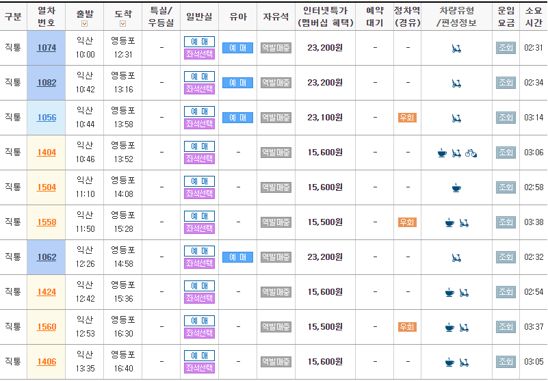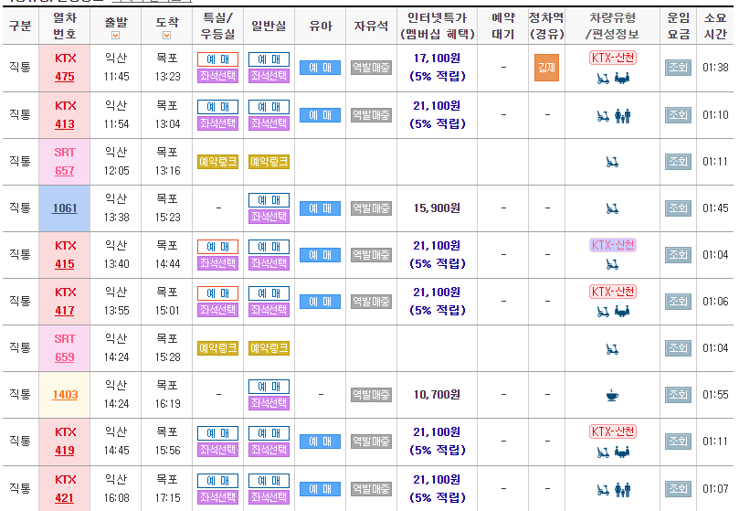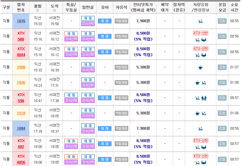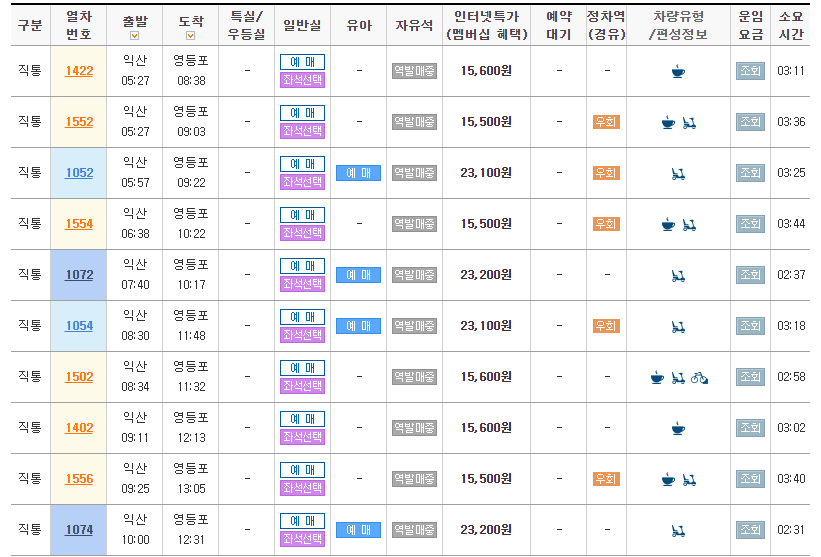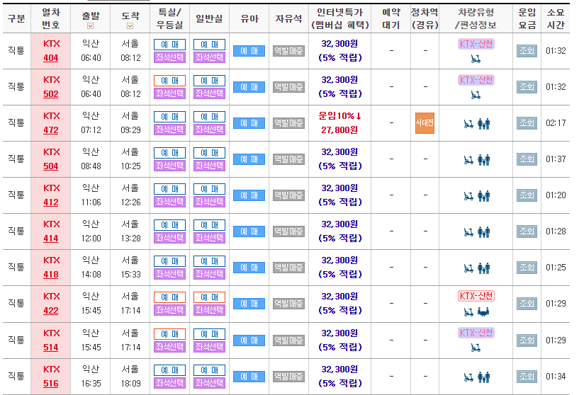 주말인 토요일 4월2일 익산역에서 서울가는 KTX 기차 첫차는 06시40분에 익산역을 출발하여 서울역에는 08시12분이 도착한다.서울역까지 요금은 32,200원이다.