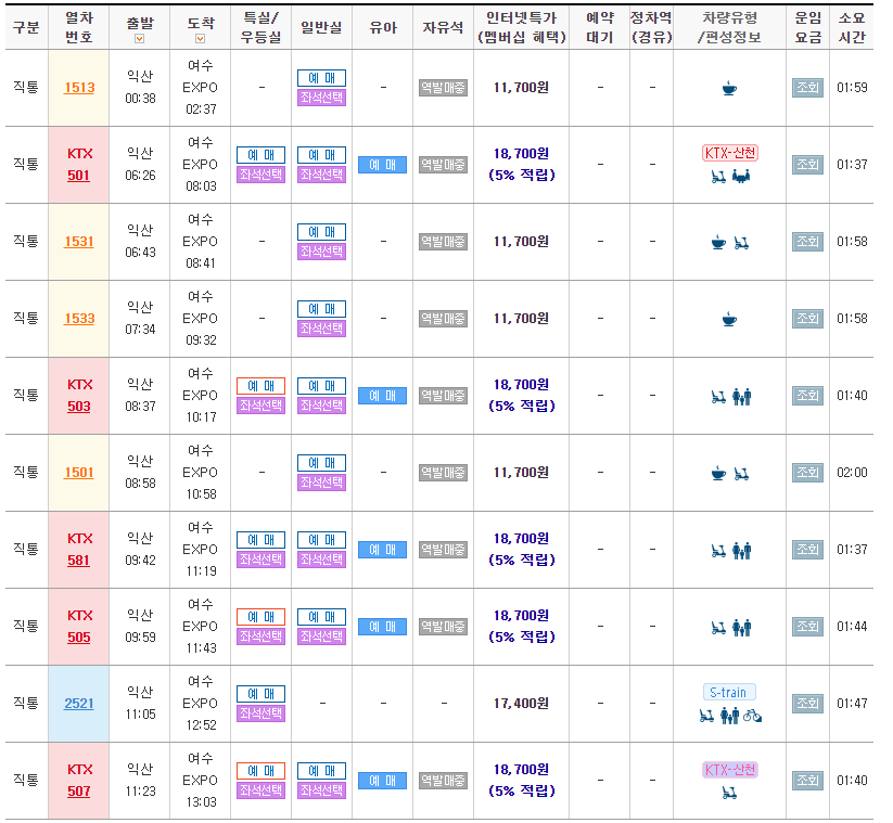 익산역에서 여수EXPO역가는 첫차는 무궁화호 기차로 익산역을 00시38분에 출발하여 종착역인 여수EXPO역에는 02시37분에 도착한다.