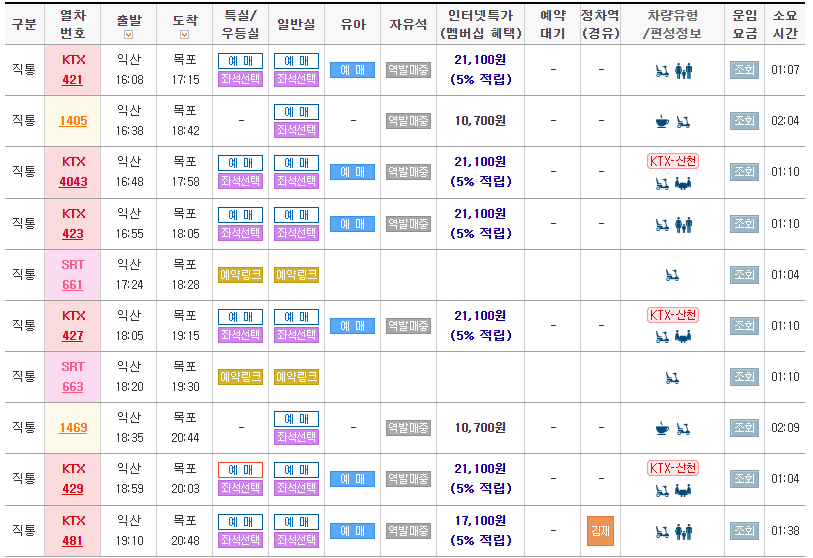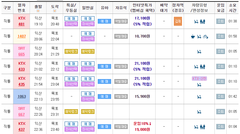 그리고 익산역에서 서울가는 KTX막차는 익산역을 21시 08분에 출발한다.