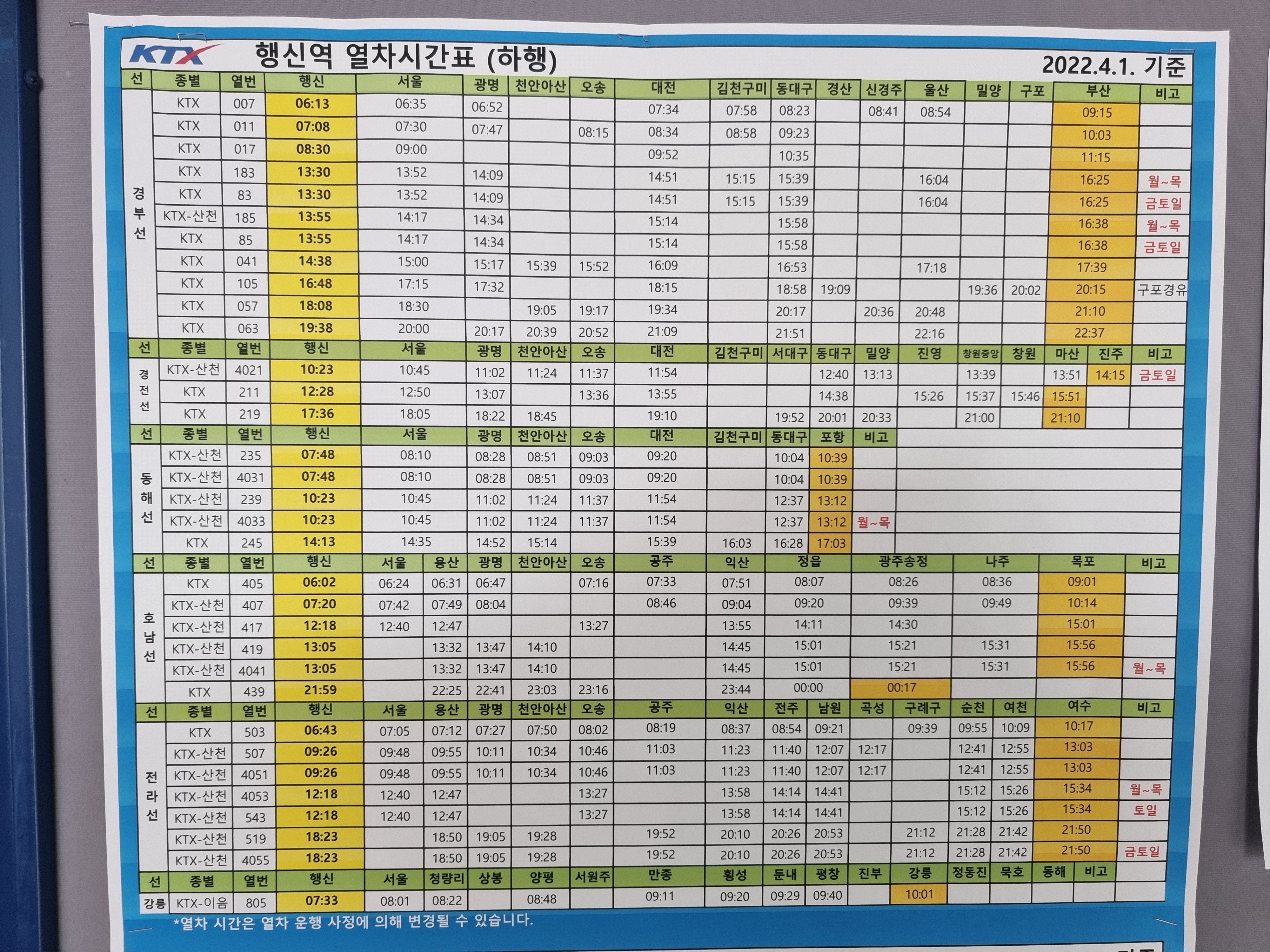 행신역 KTX 시간표(2022년 4월1일 기준)
