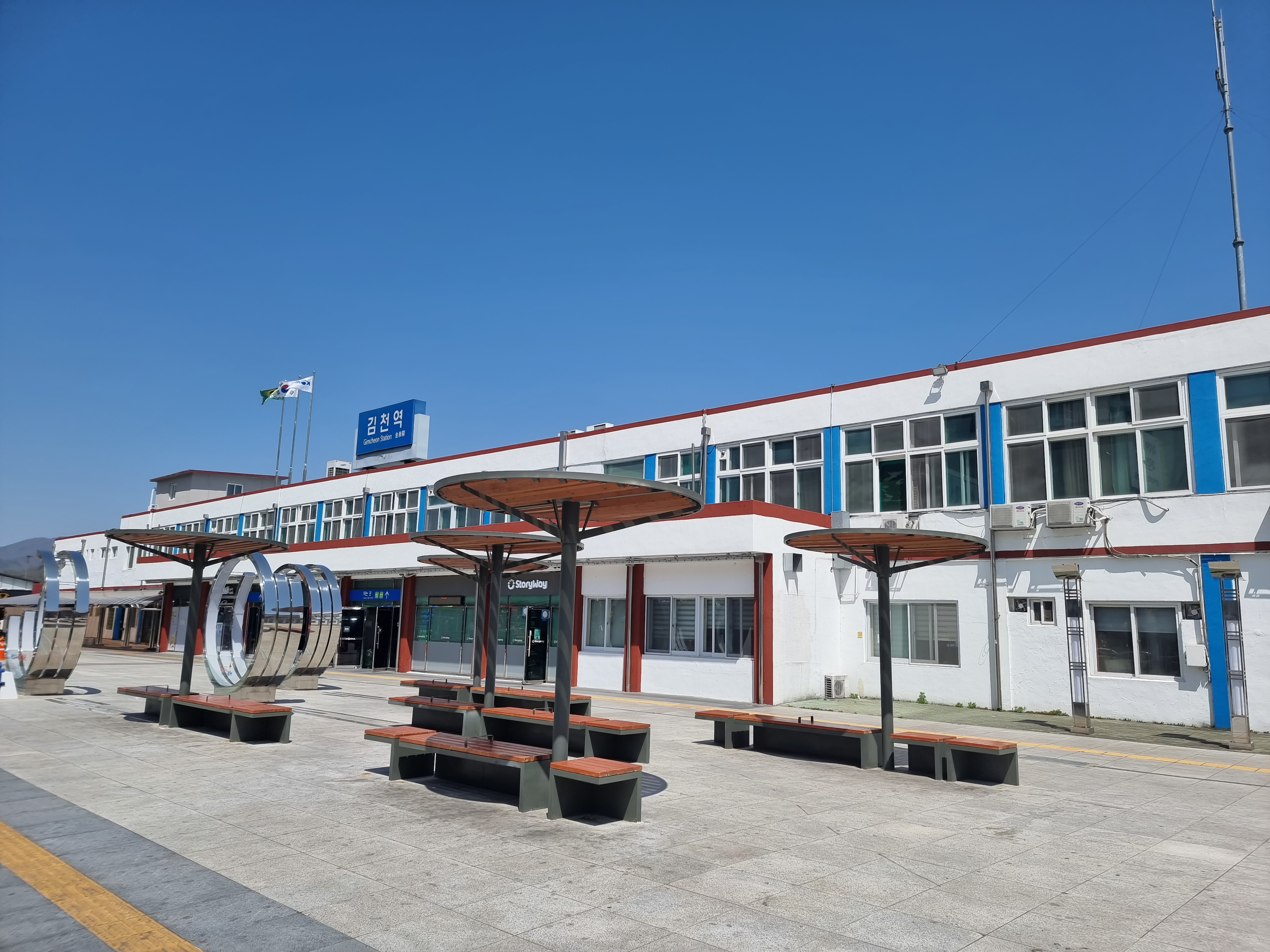 김천역에서 시외버스정류장과의 거리는 도보로 10분 거리에 있다.김천역 정문에서 좌측으로 경찰지구대 옆 철도 고가도로로 이동하면 농협하나로 마트 나오는데 길 건너편에 김천 종합터미널이 보인다.