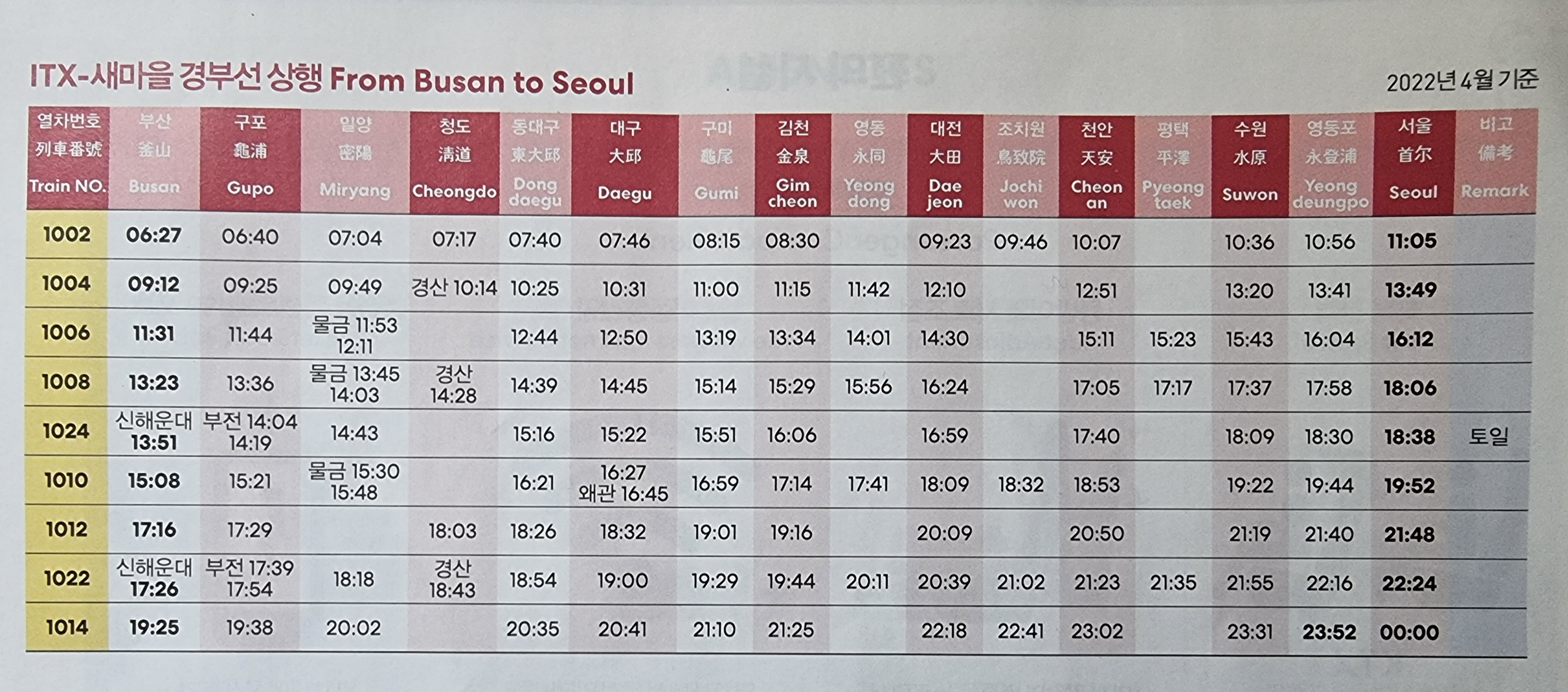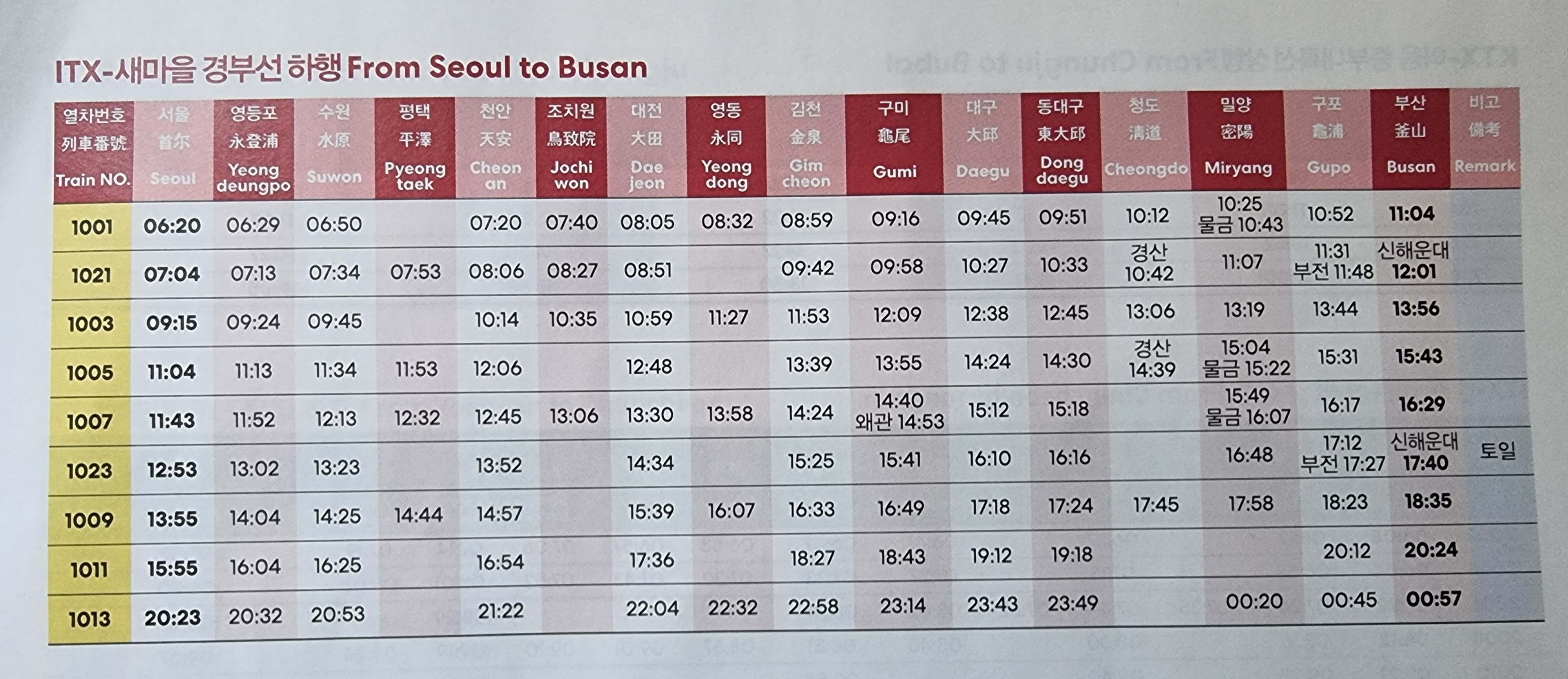 ▶경부선 하행선 ITX새마을호 시간표(서울역→김천역)