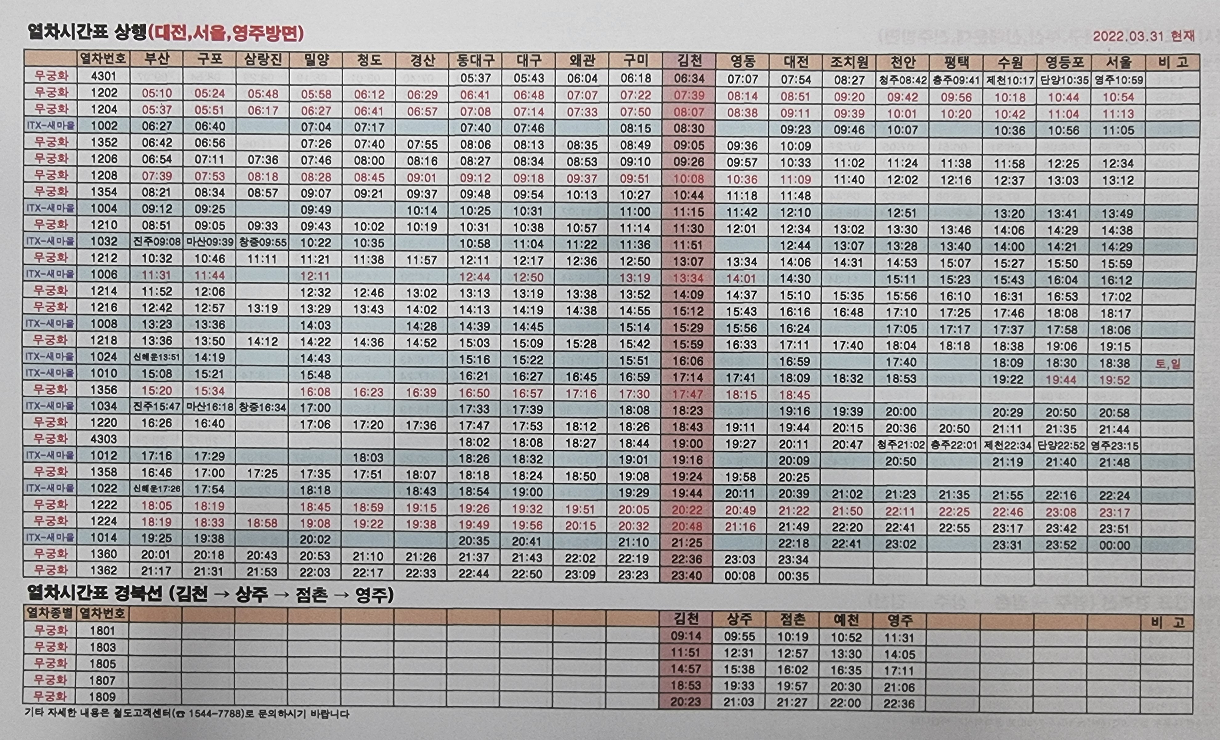 □김천역 상행선 열차 (대전/서울/영주방면) 시간표