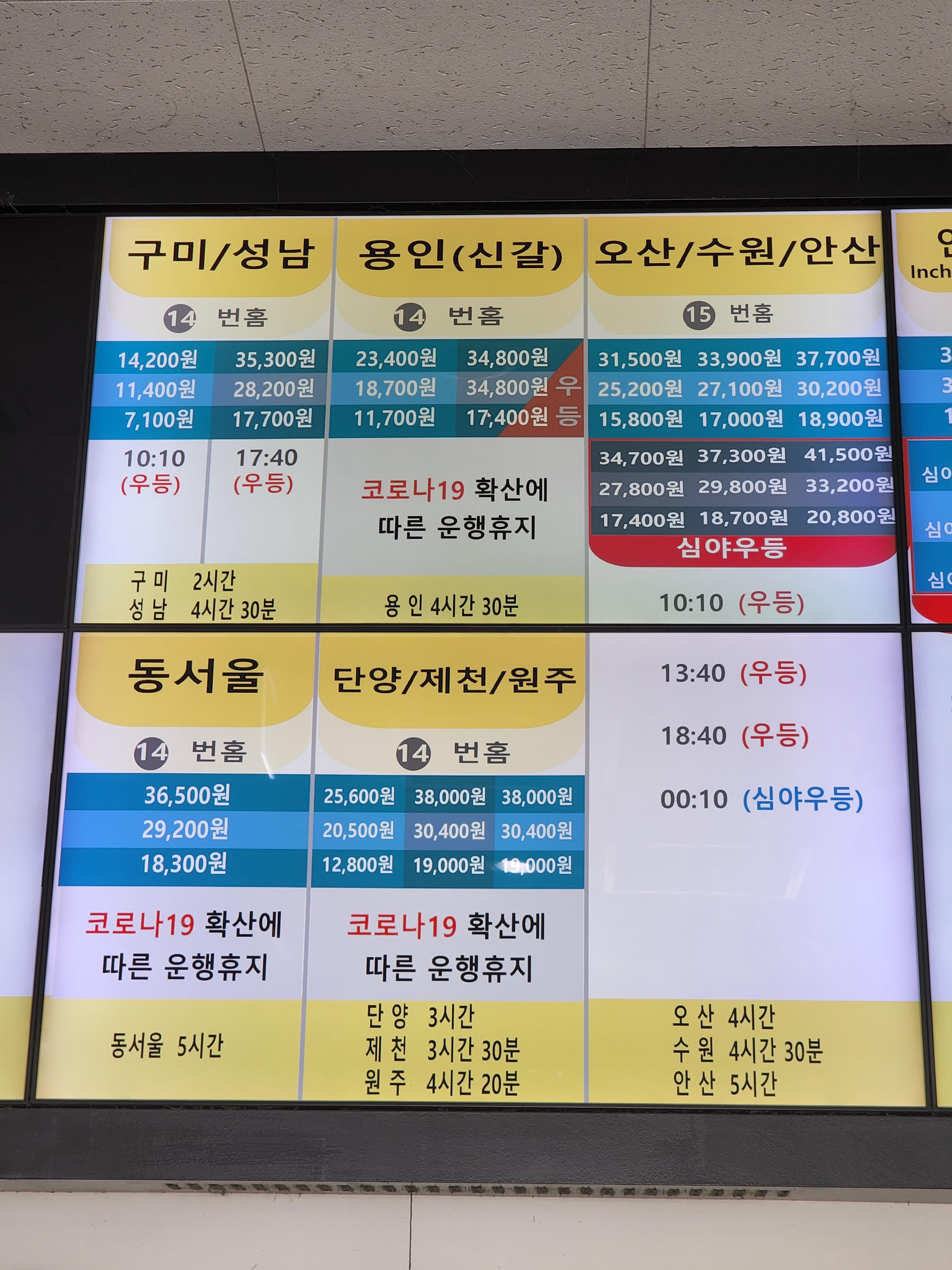 요금은 35,300원이고 소요시간은 약 4시간 50분이 소요된다.성남행은 구미를 경유한다.