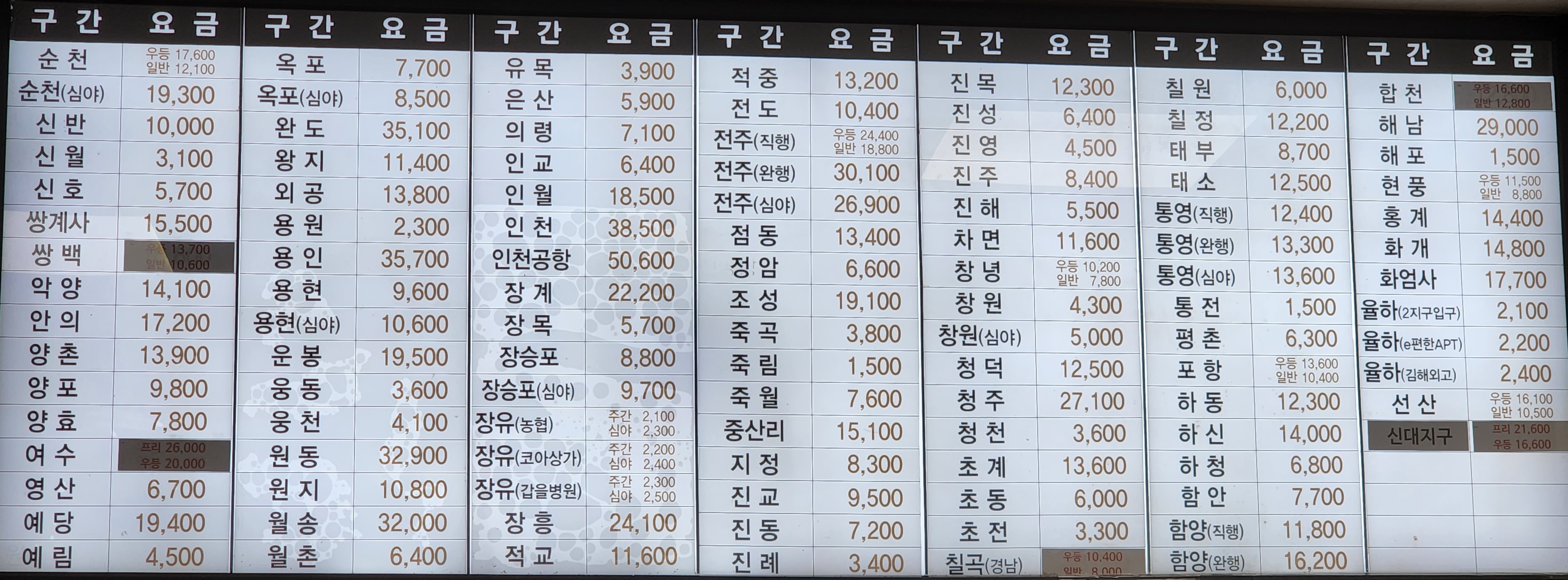 부산사상에서 광주까지 요금은 우등은 24,200원이고 소요시간은 약 3시간이 소요된다.