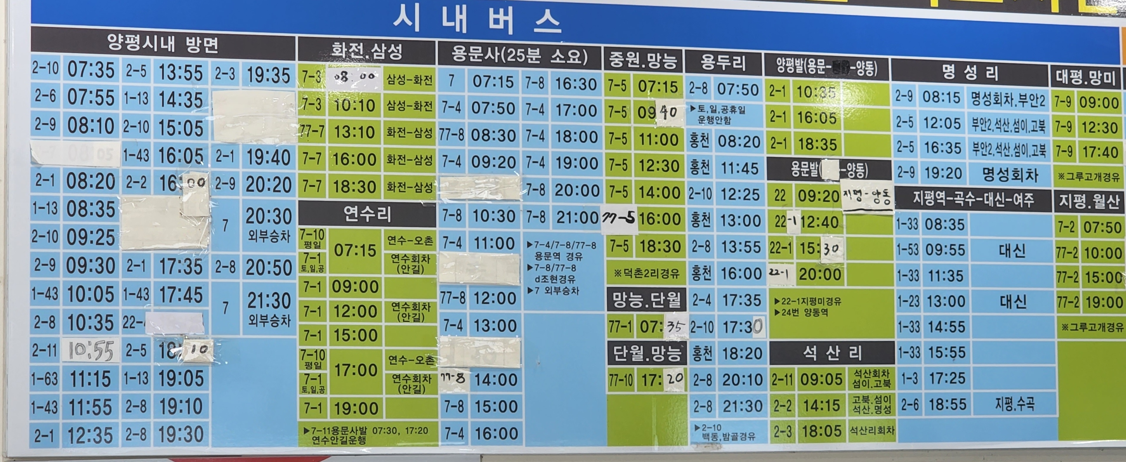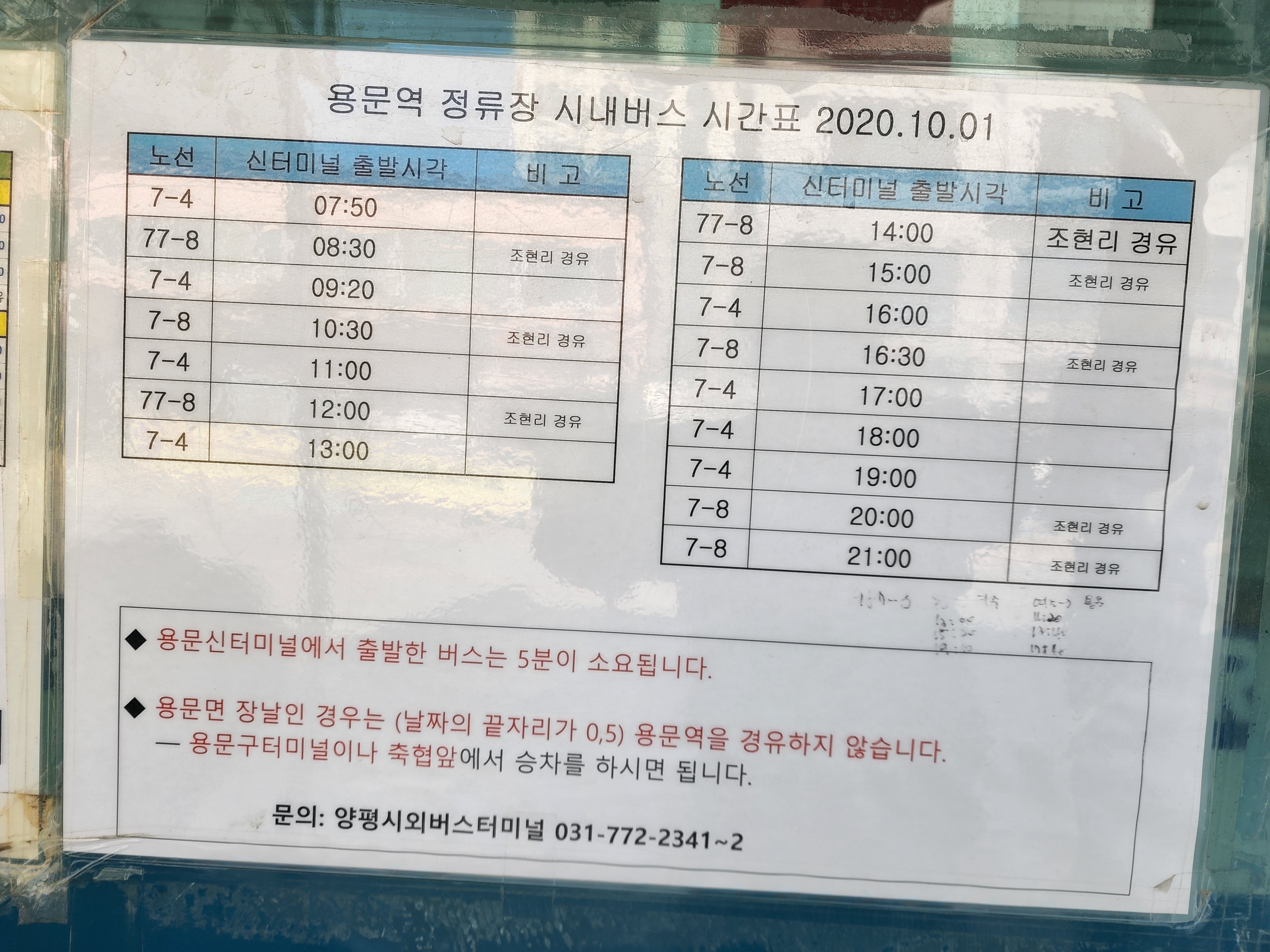 첫자는 07시50분,막차는 21시30분에 용문터미널을 출발한다.
