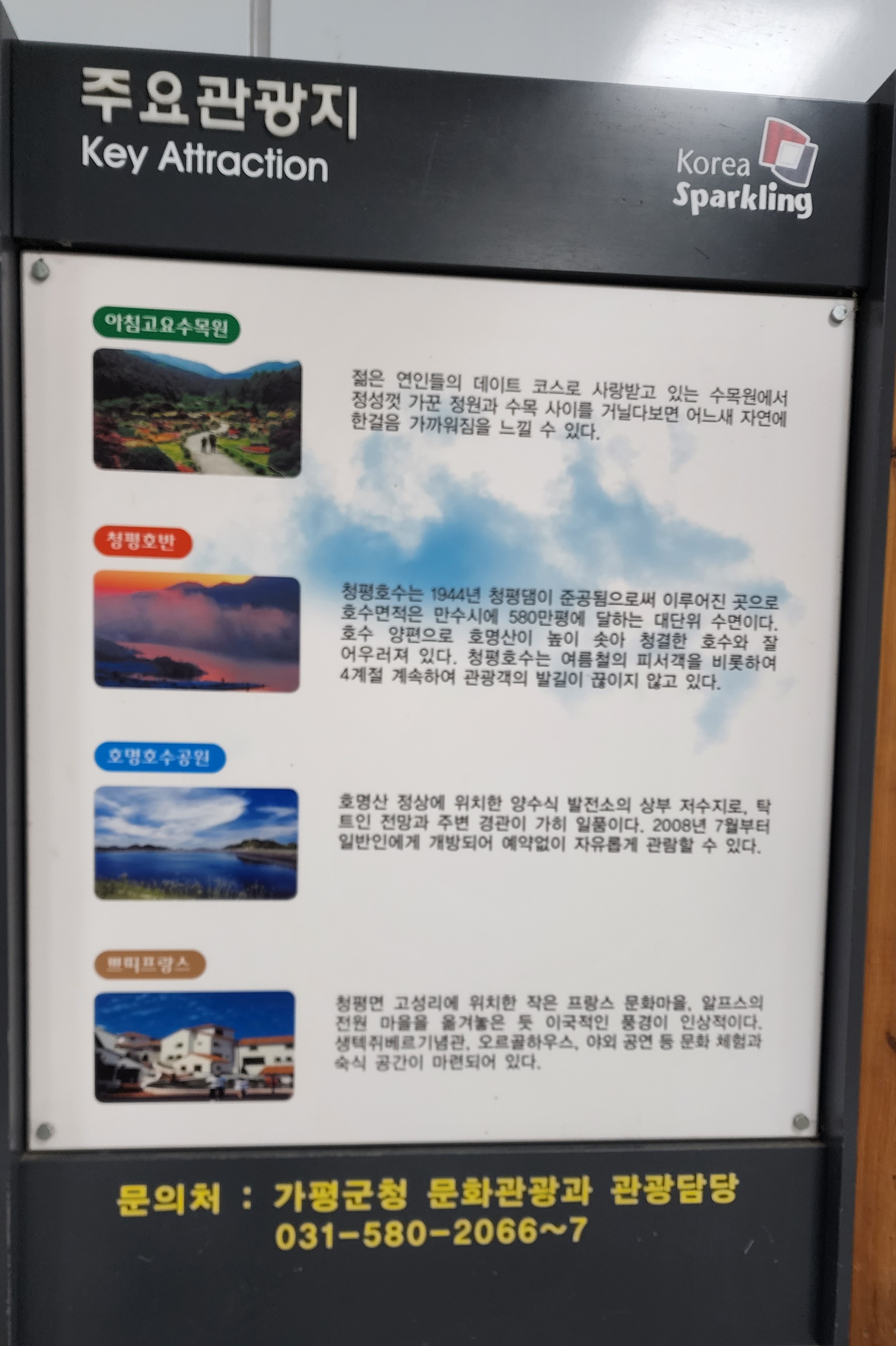 청평의 관광지는 청평댐에서 남이섬 방향으로 호숫가 길을 따라 10km 가다보면 왼쪽 언덕에 이국적인 건물들이 들어서 있는 쁘띠프랑스,가평군 외서면 청평리에 있는 댐식 수력발전소인 청평수력 발전소,청정한 약수물을 마시며 산책도 할 수 있고 자연과 함께 숨 쉬는 공간으로 복잡한 유원지를 피해 호젓한 자연을 즐길 수 있는 청평자연휴양림 등이 있는 곳이다.
