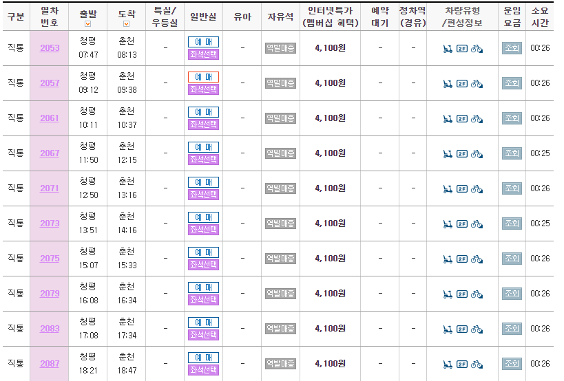 주말인 토요일 청평역에서 춘천역가는 ITX청춘열차는 첫차는 청평역을 07시47분에 출발하여 춘천역에는 약 26분이 소요되어 8시13분에 도착한다.