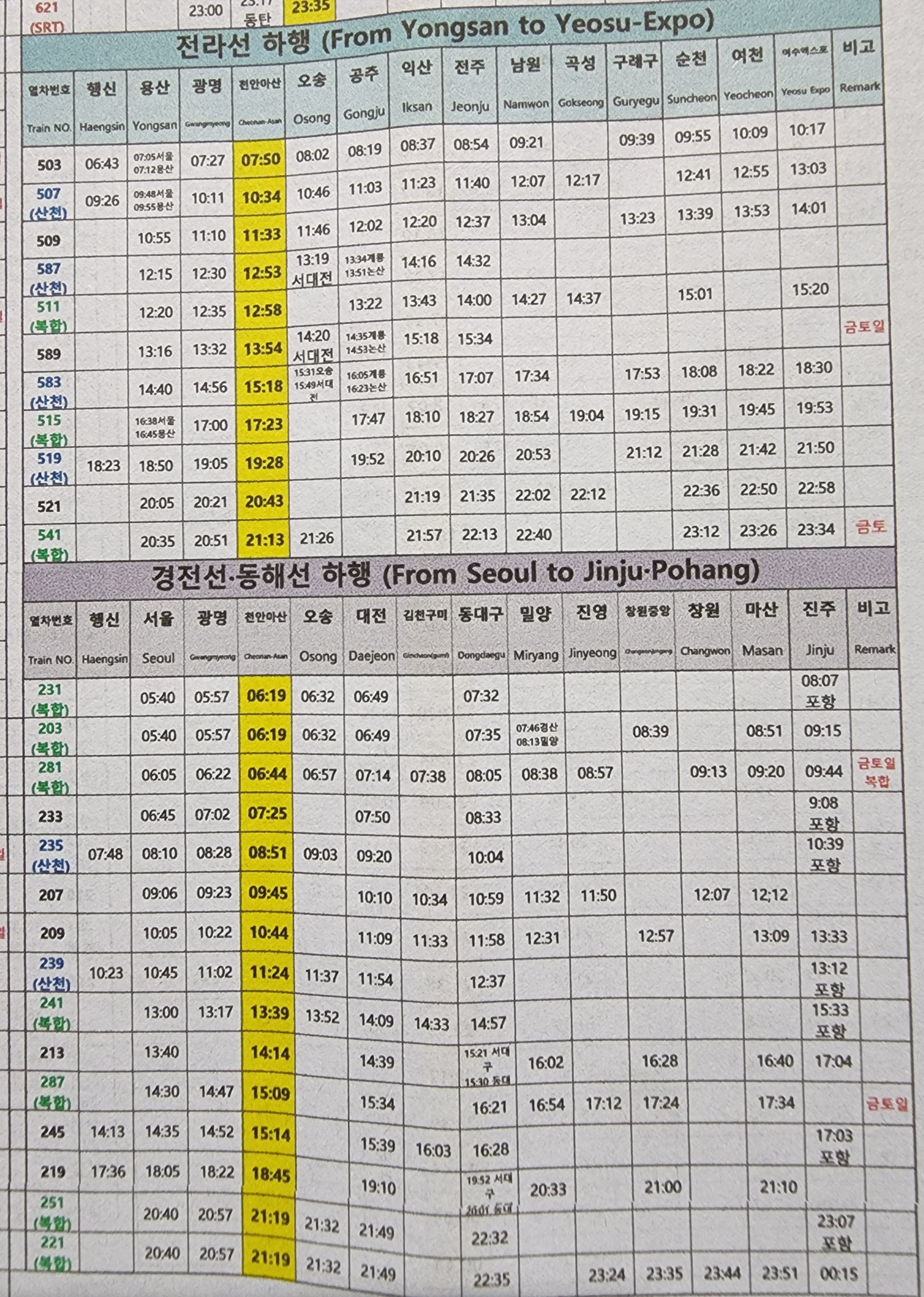 ▶전라선 하행 시간표(천안아산역→여수엑스포)