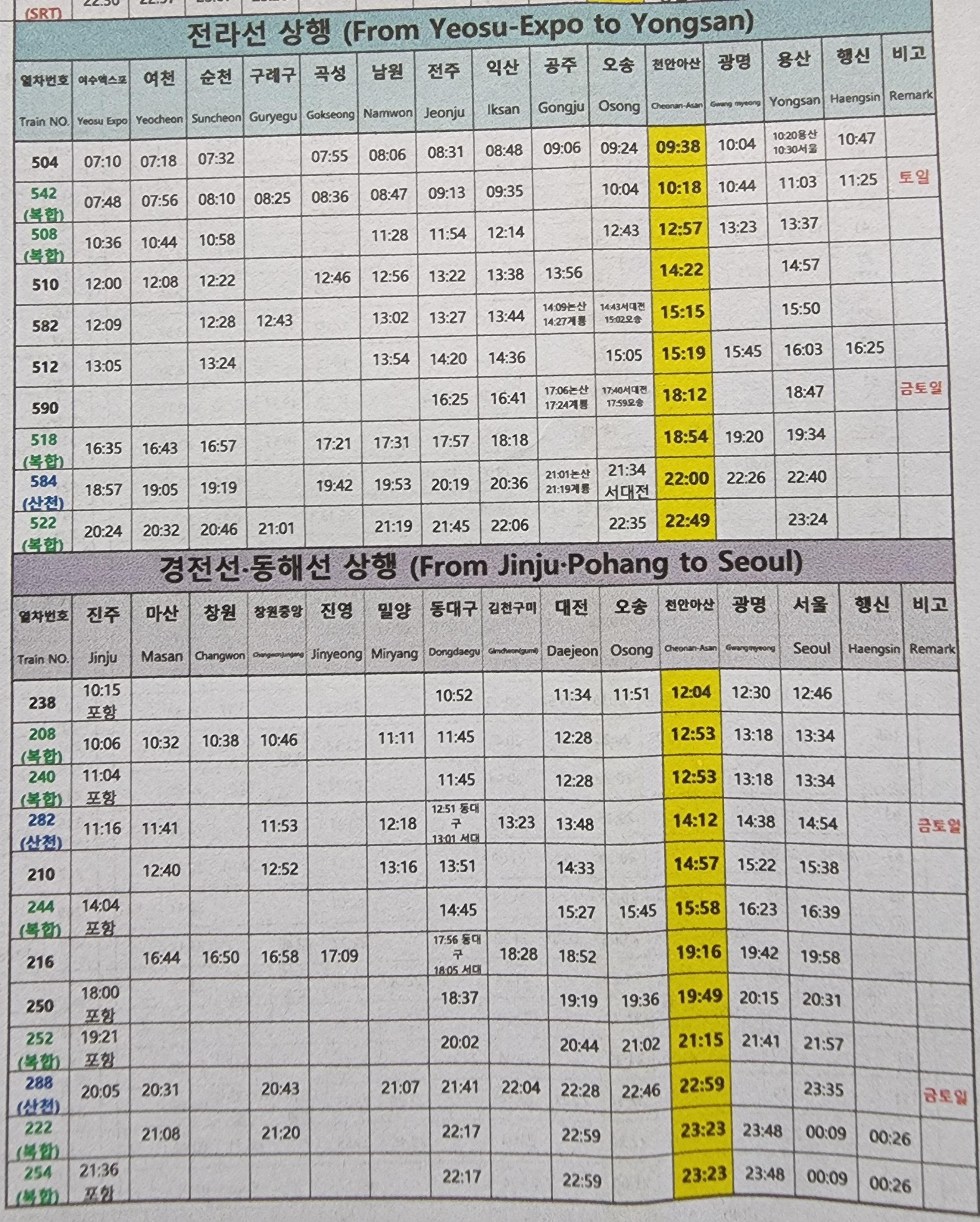 천안아산역의 노선의 고속철도 KTX와 SRT시간표에 대하여 알아보자.