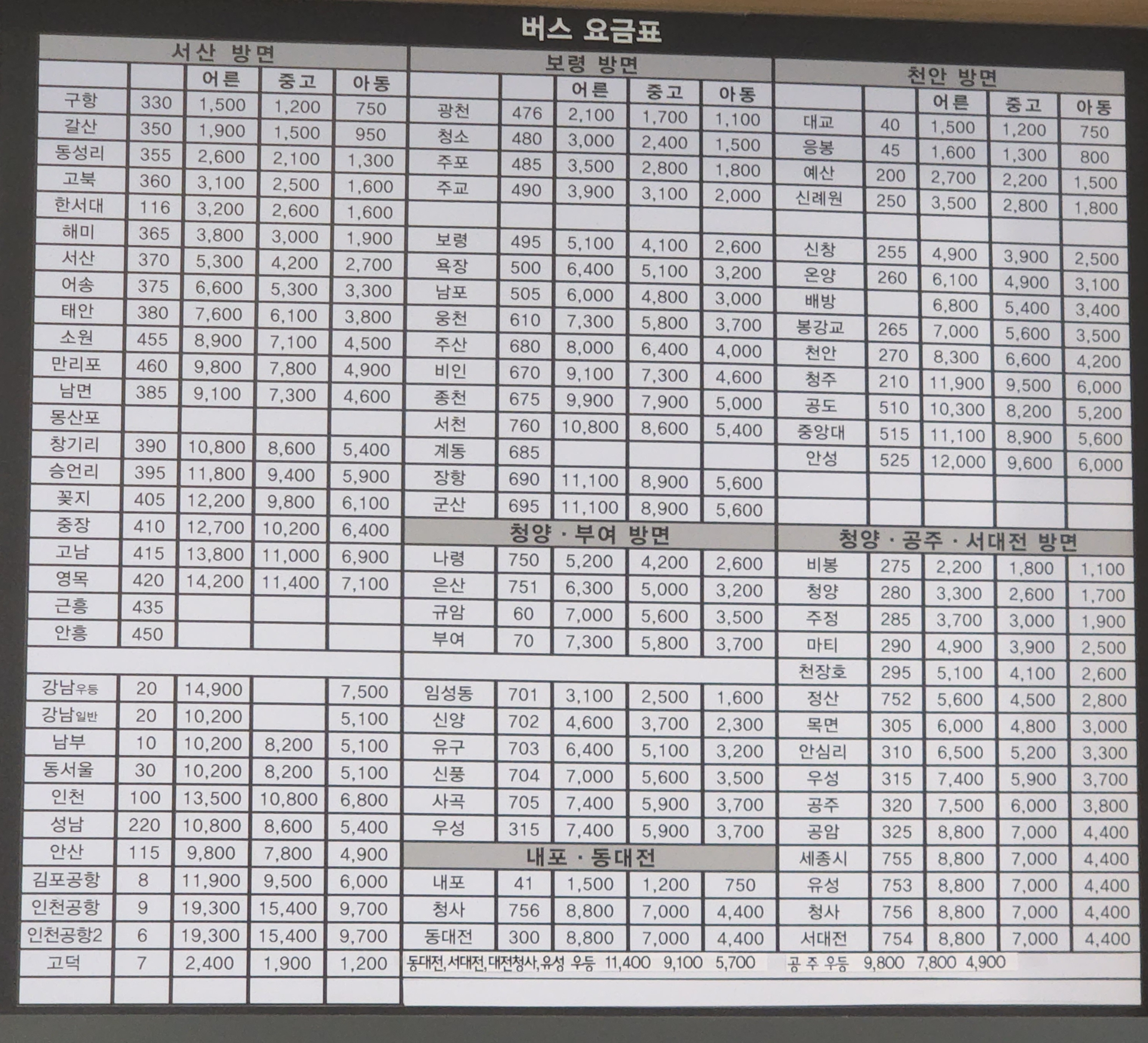 인천까지 요금은 13,500원이고 소요시간은 홍성을 출발하여 내포,예산,신례원,신창을 경유하여 인천에 도착하는데 약 3시간 30분이 소요된다.