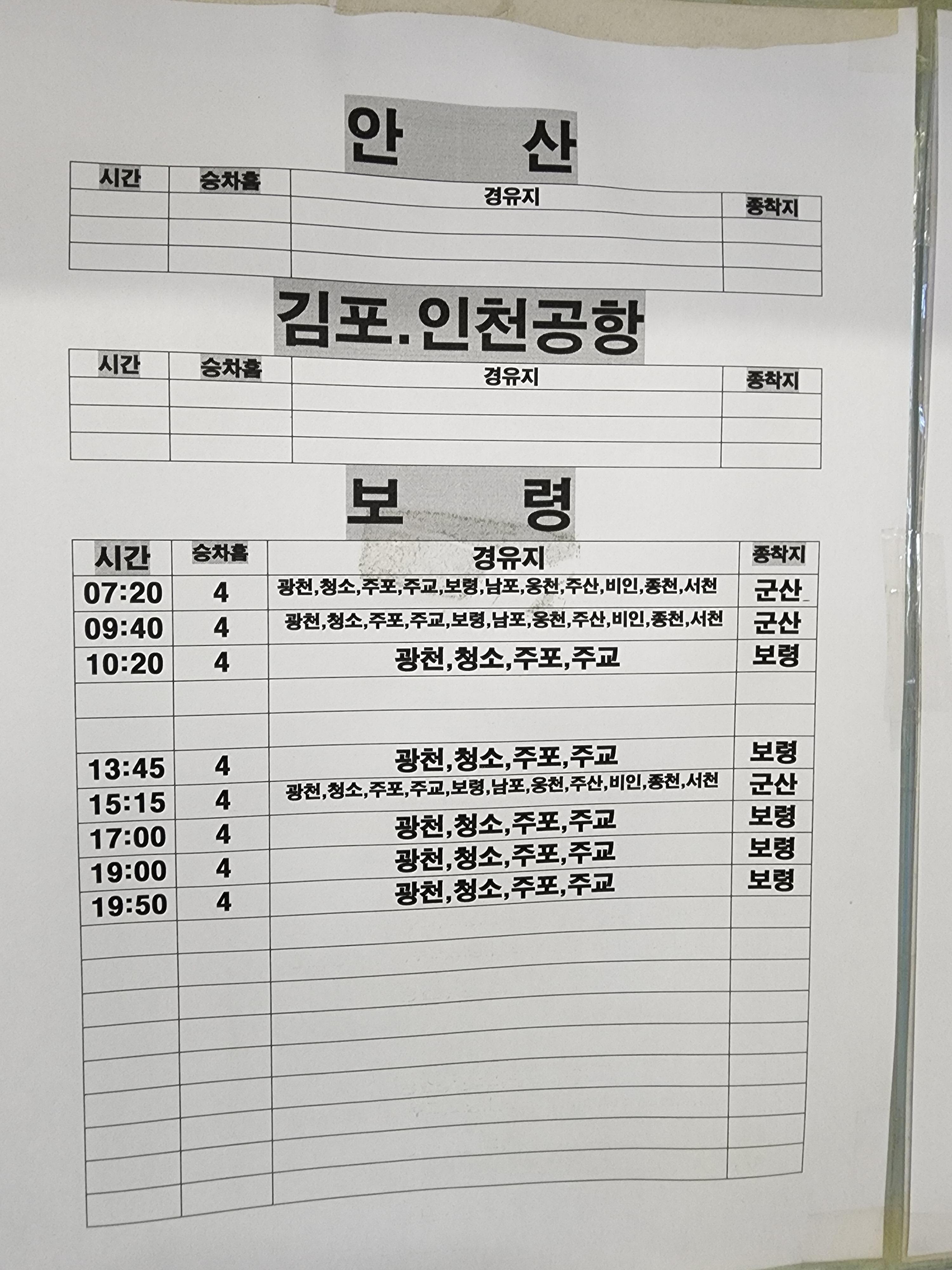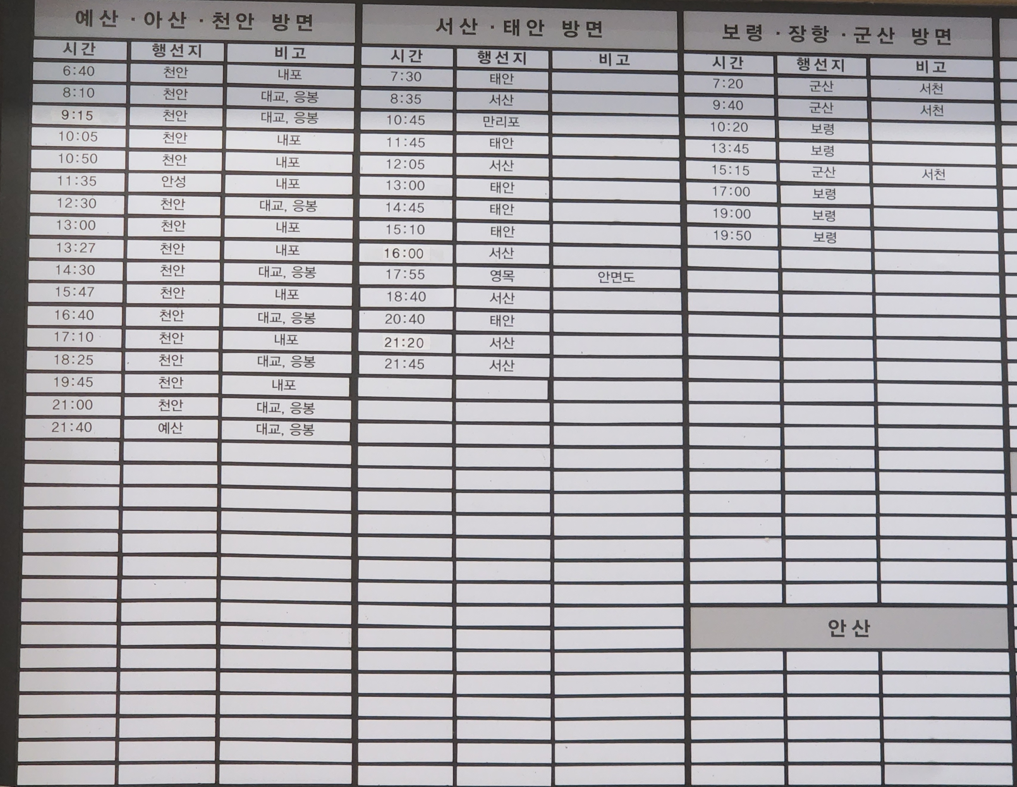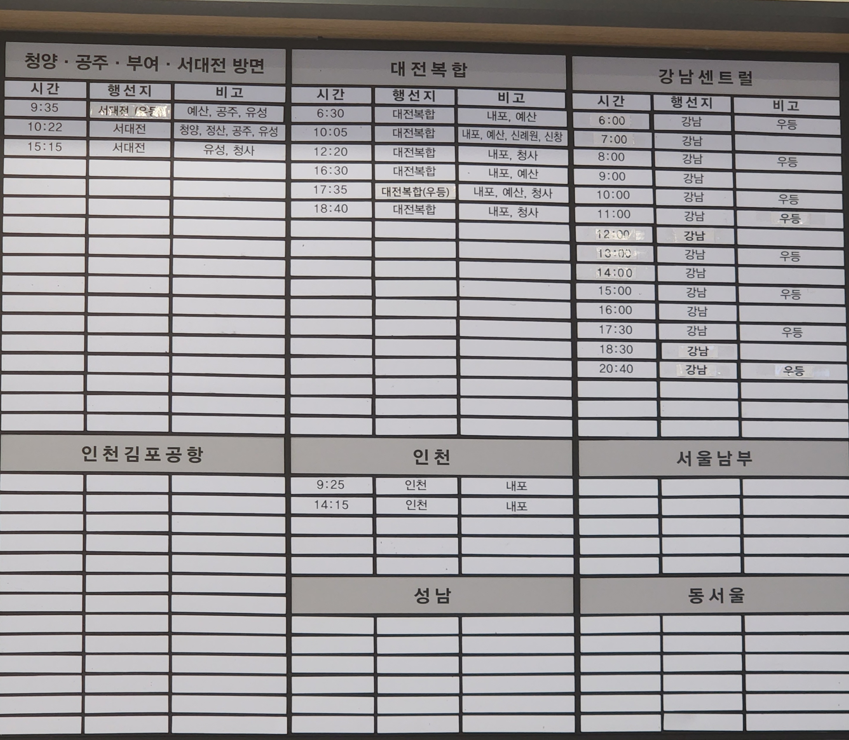 이외 다른 노선에 대한 시간표를 알고 싶으면 '고속버스 티머니' 나 '시외버스 티머니'그리고 '버스타고' 앱에서 확인이 가능하다.