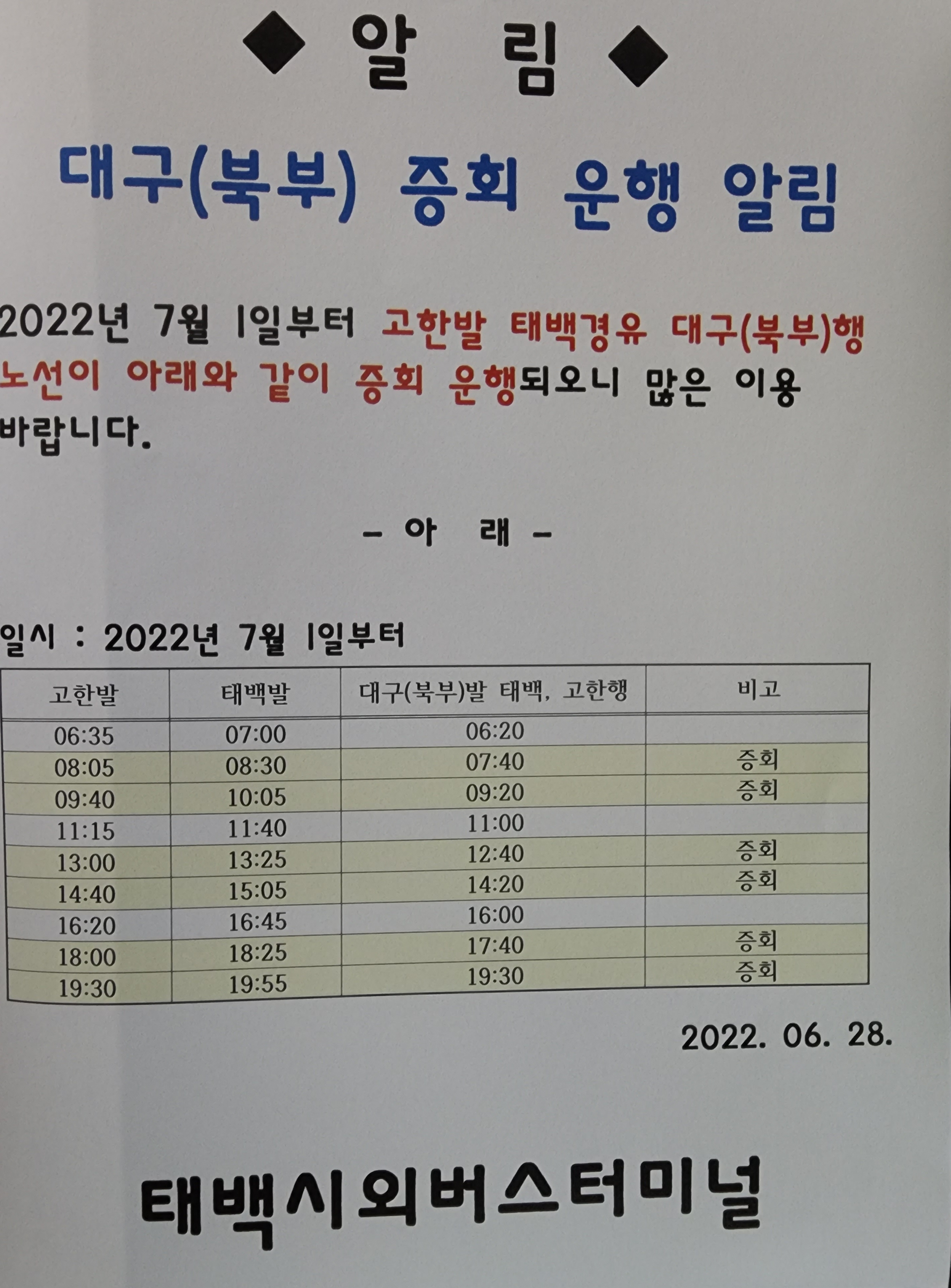 태백에서 대구가는 시외버스는 7월1일 부로 증차하여 운행하는데 버스 시간은 07시/08시30분/10시05분/11시45분/13시25분/15시05분/16시45분/18시25분/19시55분에 태백을 출발한다.