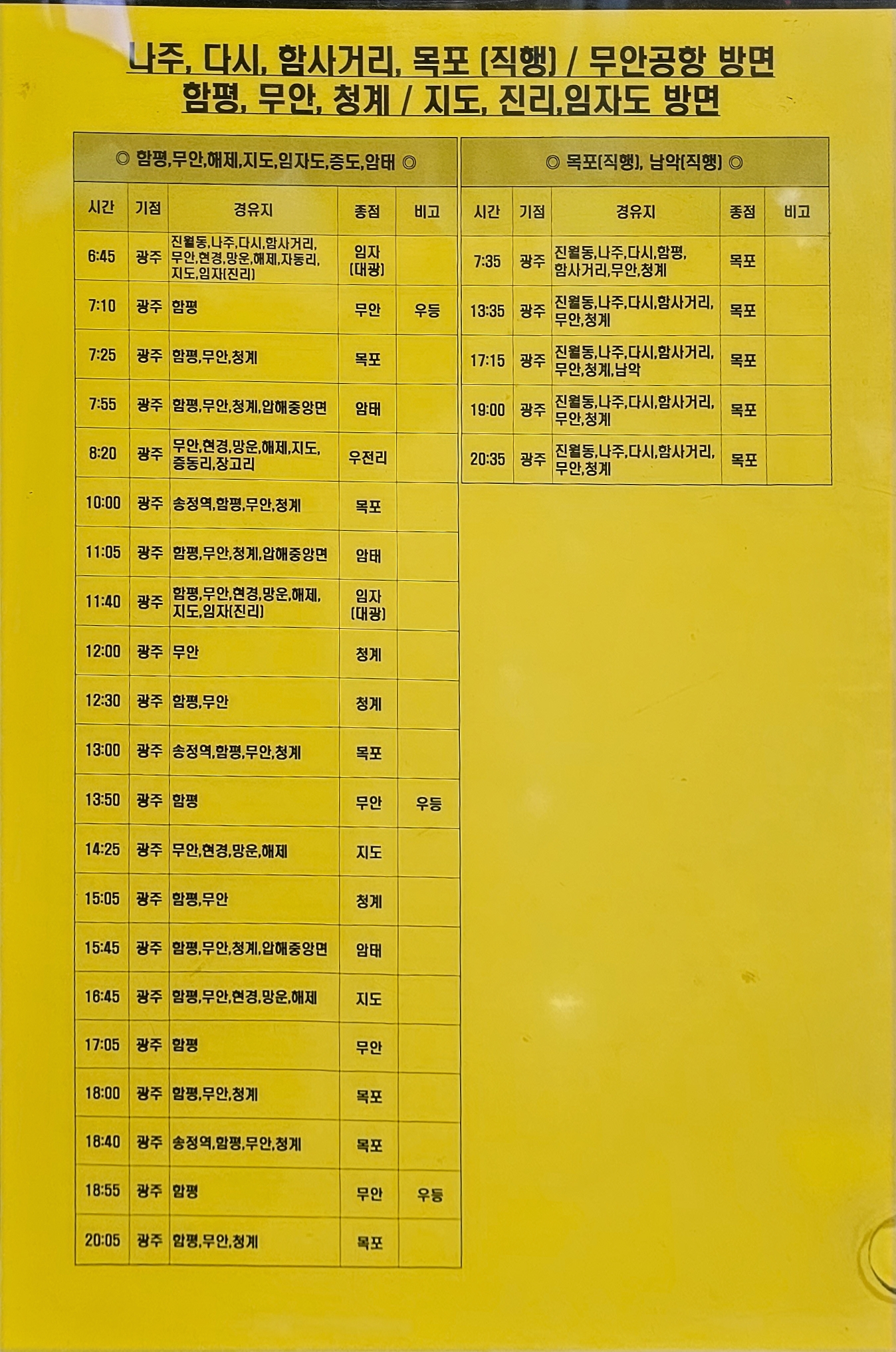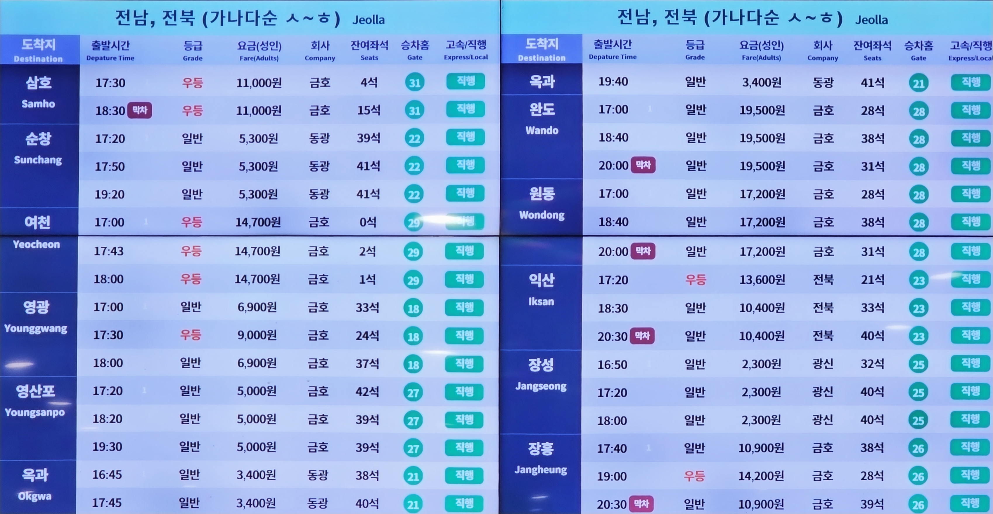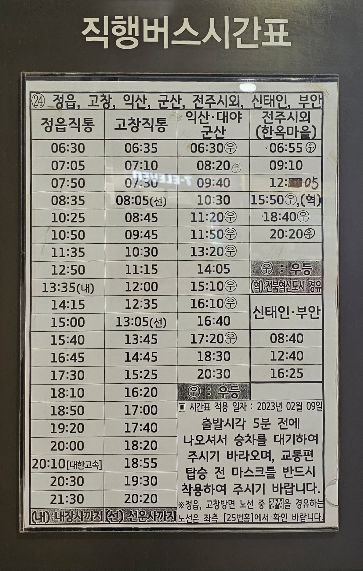 ▶직행(시외버스 노선) 시간표(2023년 6월21일 기준)