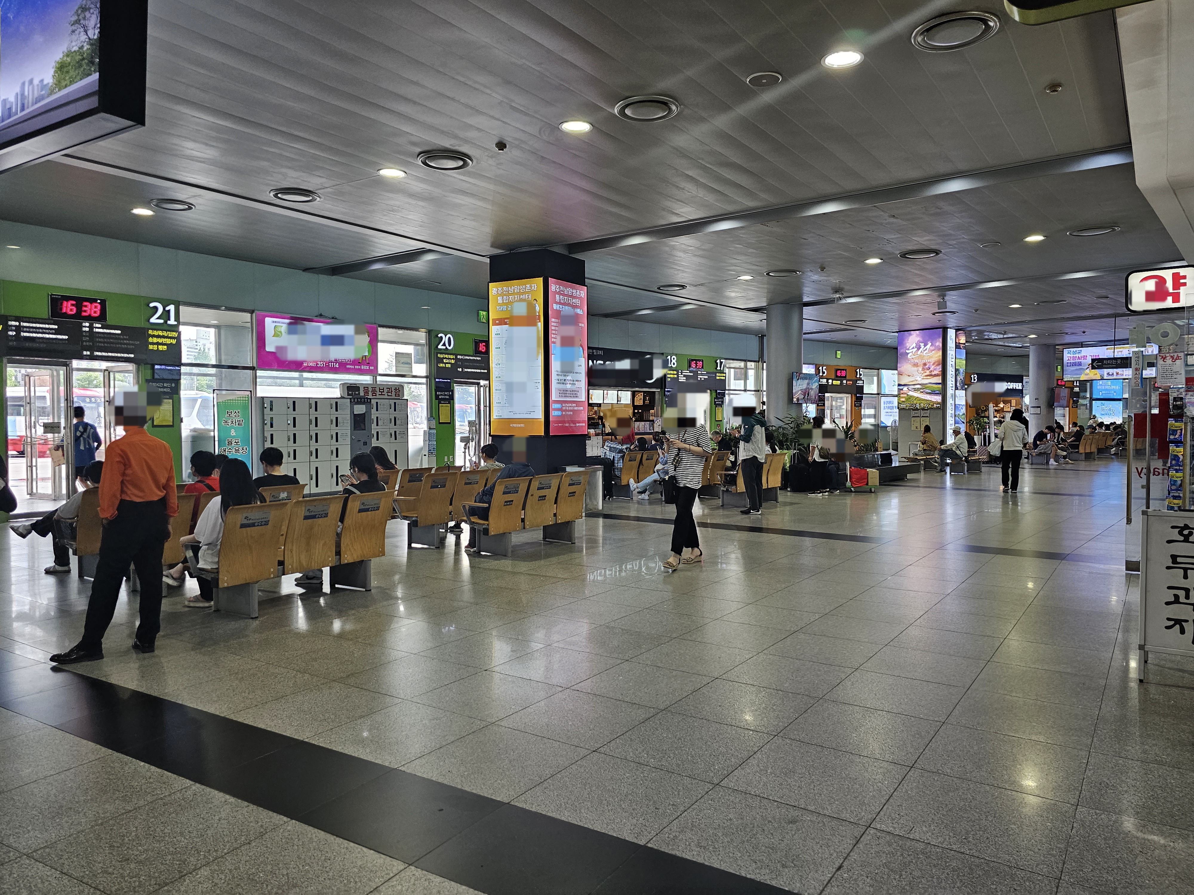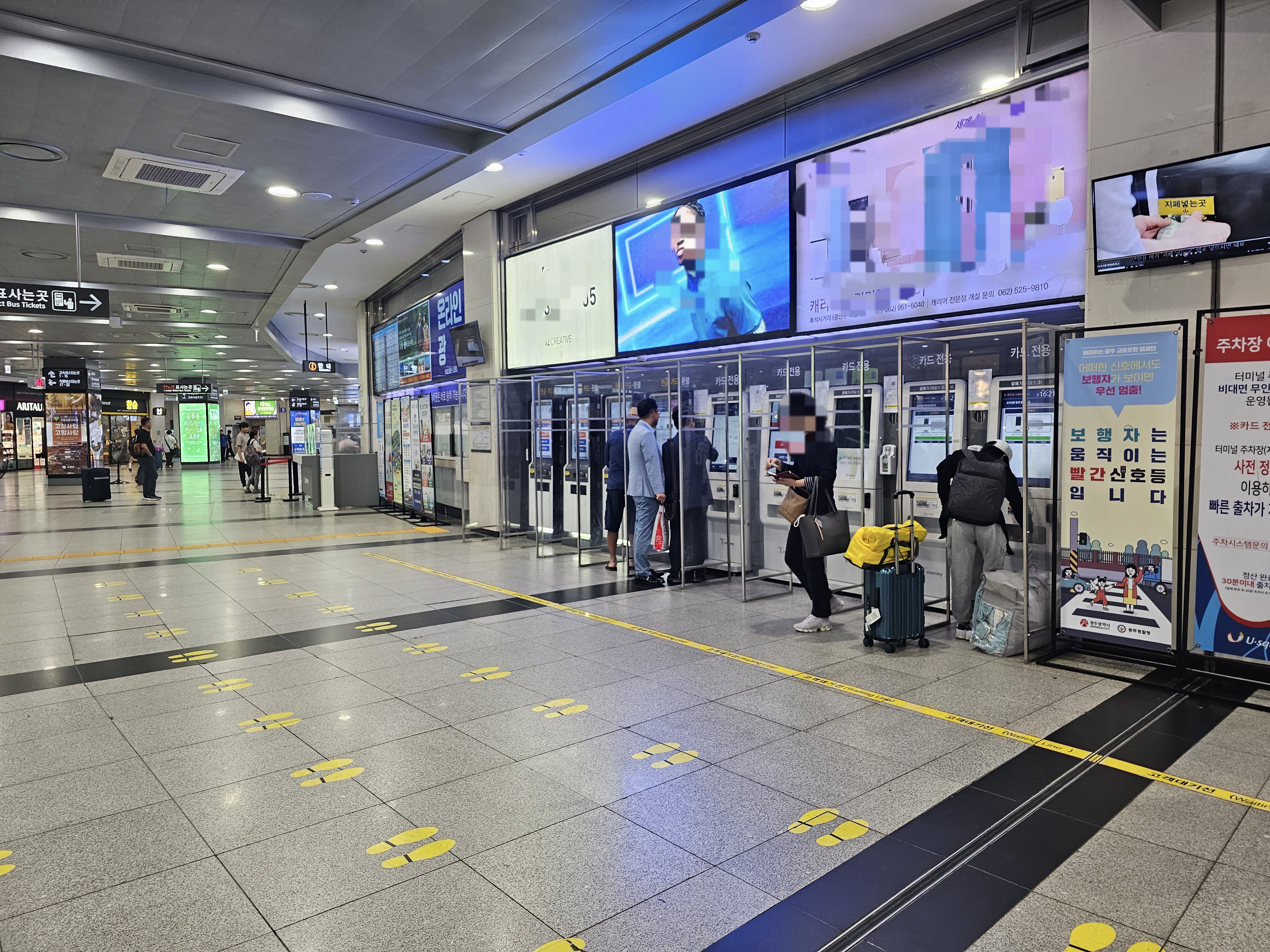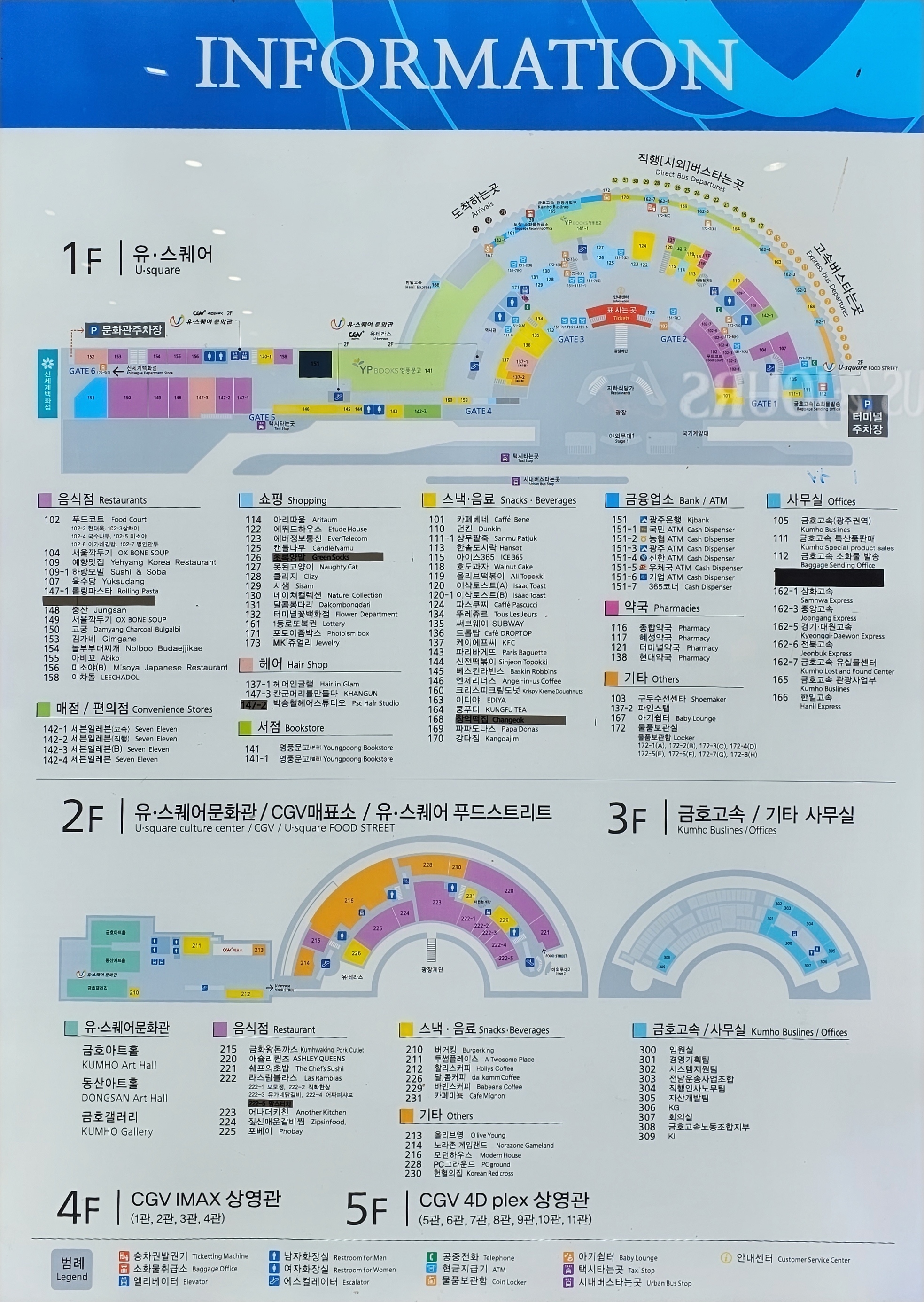 광주종합버스터미널 유스퀘어는 1층에 매표소와 승차장 그리고 음식점은 1층과 2층에 입점해있고,3층은 운수사 사무실,4층은 cgv 영화관이 들어서 있다.