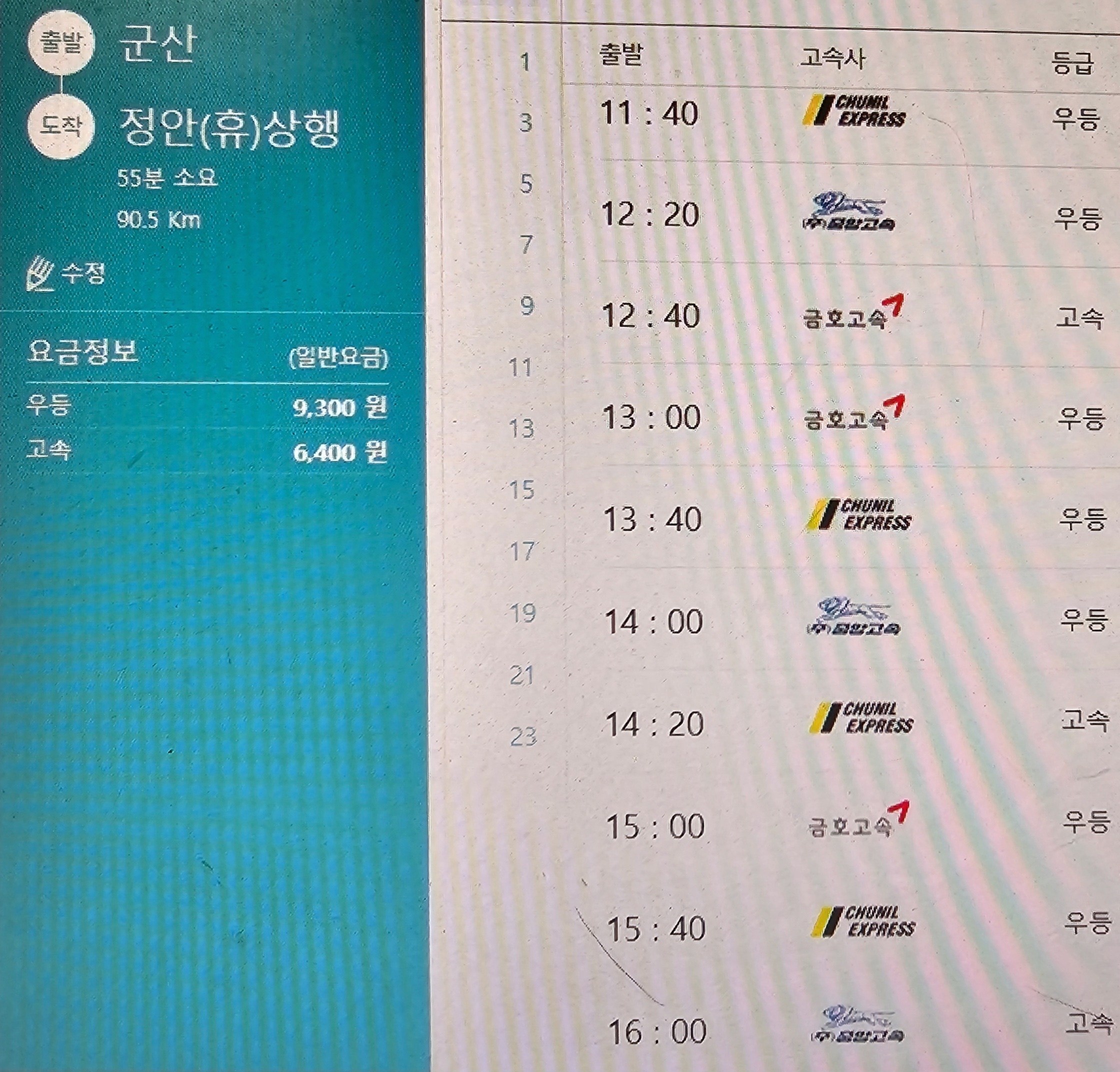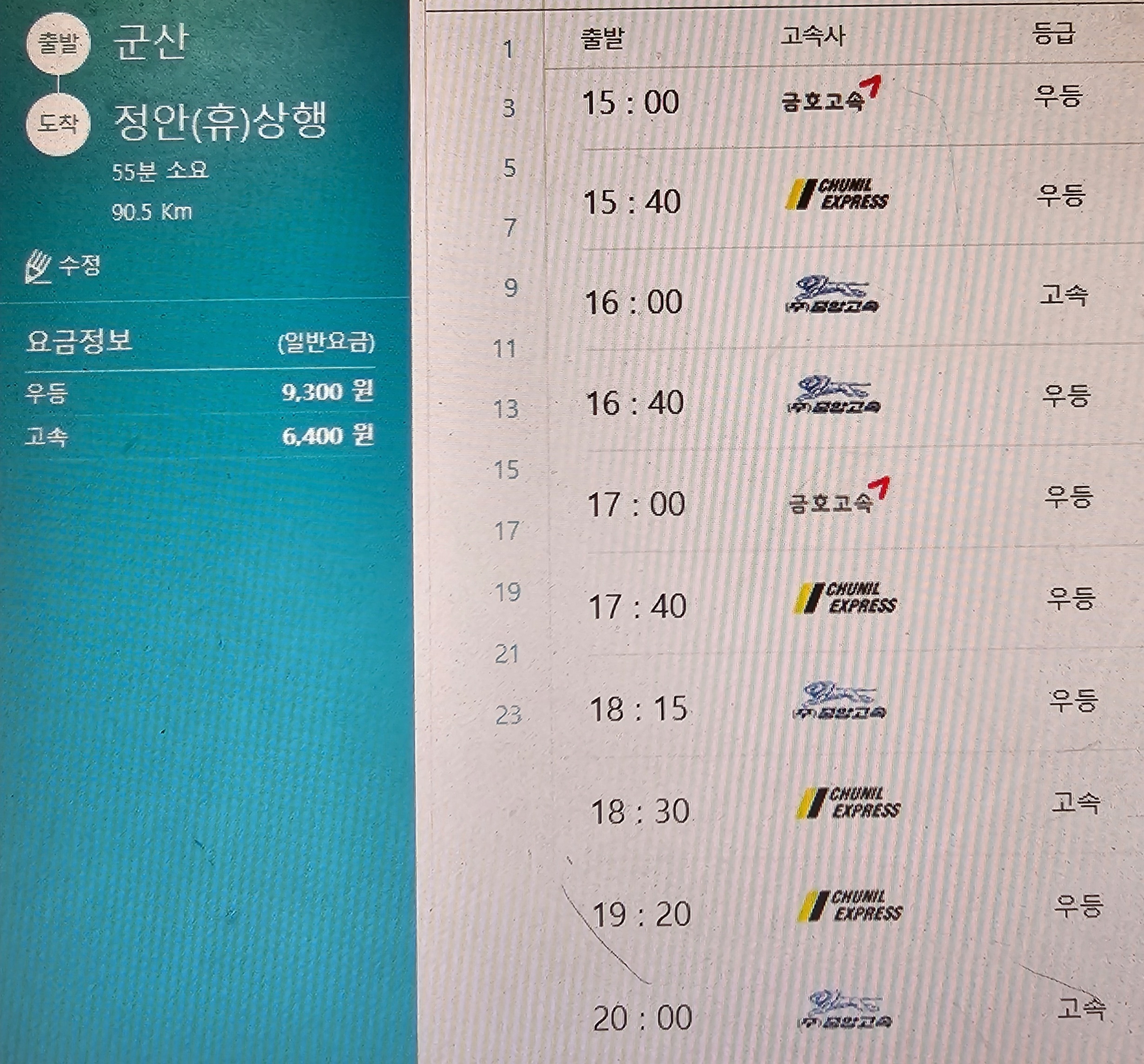 군산고속버스터미널에서 고속버스 환승이 가능한 정안(휴) 상행선 가는 버스 첫차는 07시 우등이 운행하고,요금은 9,300원이고 소요시간은 약 55분이 소요된다.