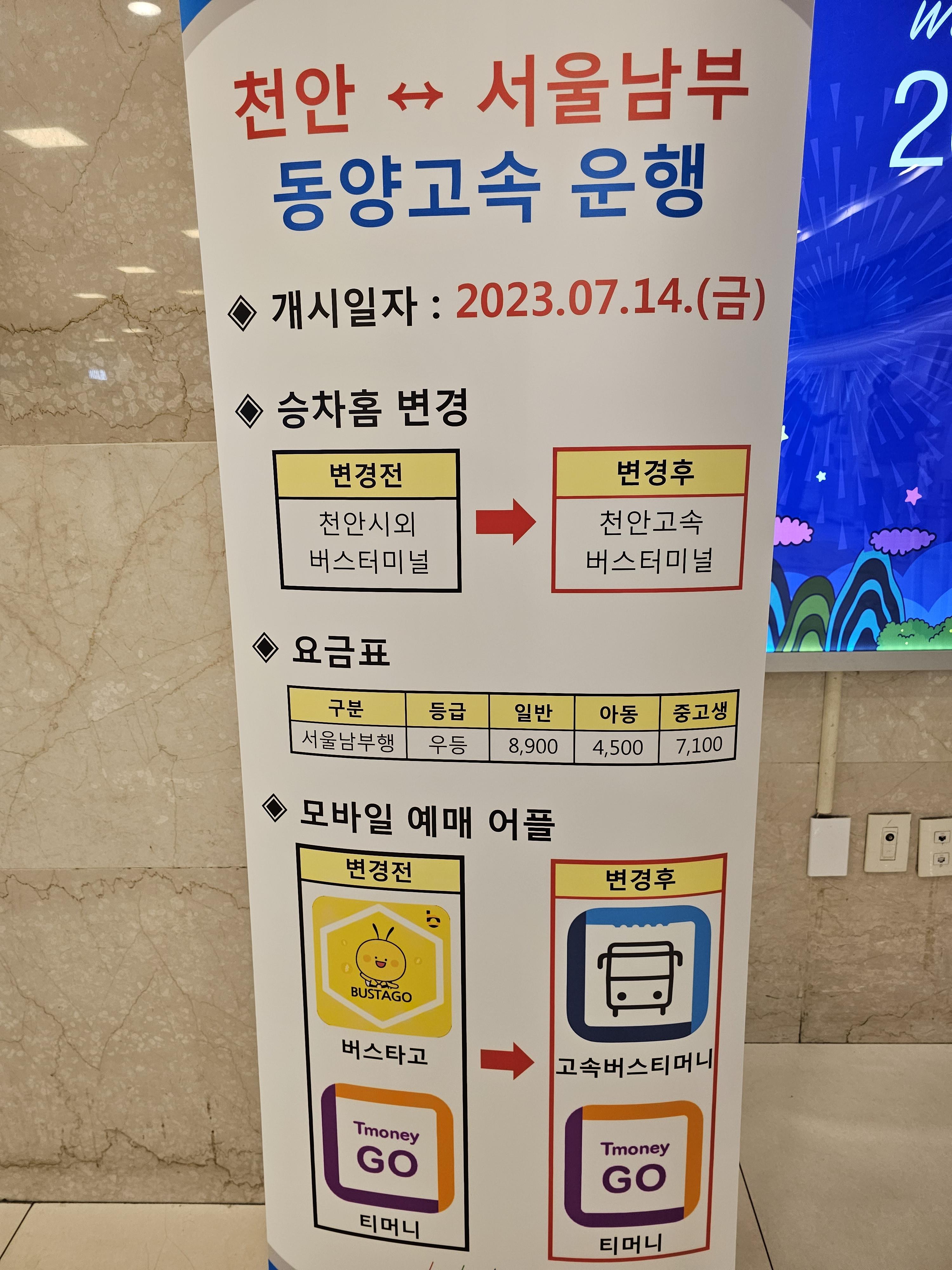 천안시외버스터미널 노선으로 운행되던 서울남부 방면은 2023년 7월 14일 부터는 천안고속버스터미널 노선으로 변경되어 고속버스터미널에서 승차 하여야 한다.