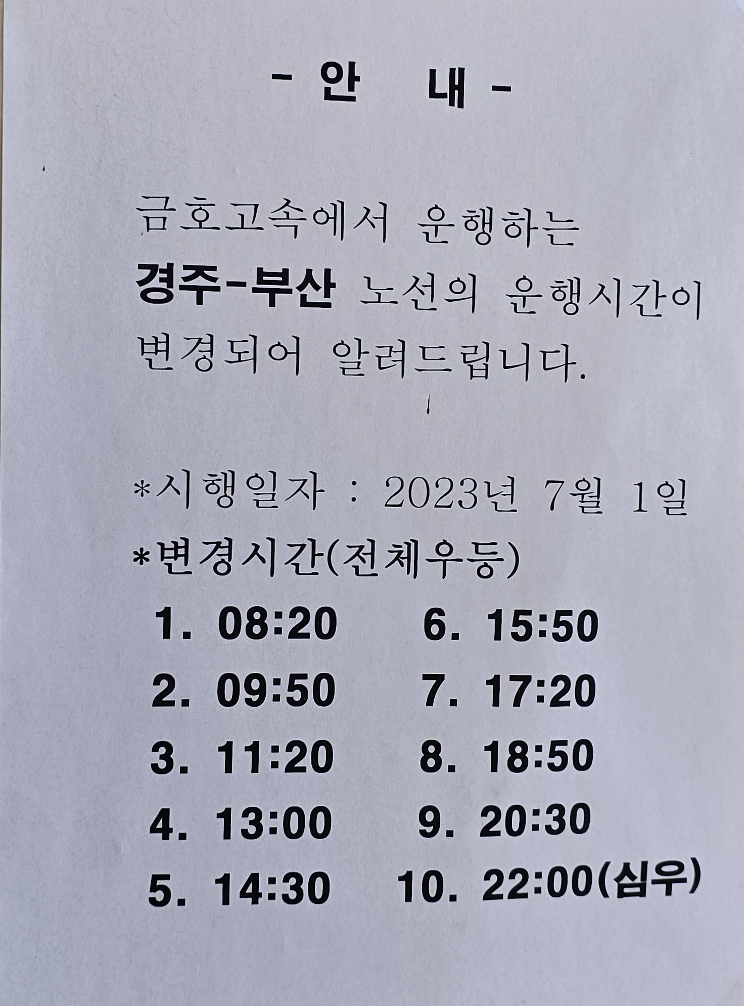 경주고속버스터미널에서 동대구나 광주 방면은 예매가 되지 않고 현장 발매만 가능하고 시간표 변경이 될수 있으므로 버스 이용 전에 경주 고속버스터미널로 연락하여 운행여부를 확인 하여야 한다.