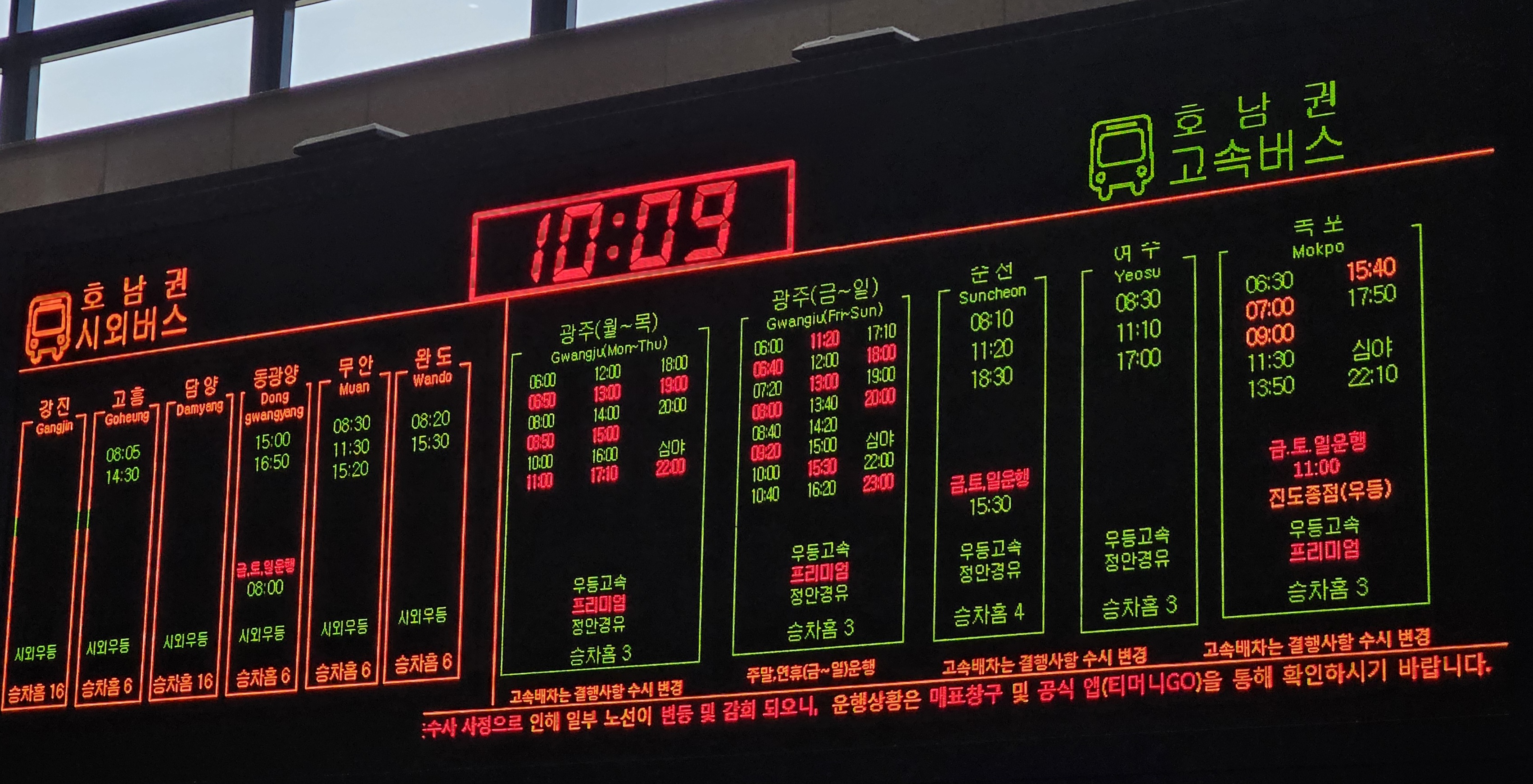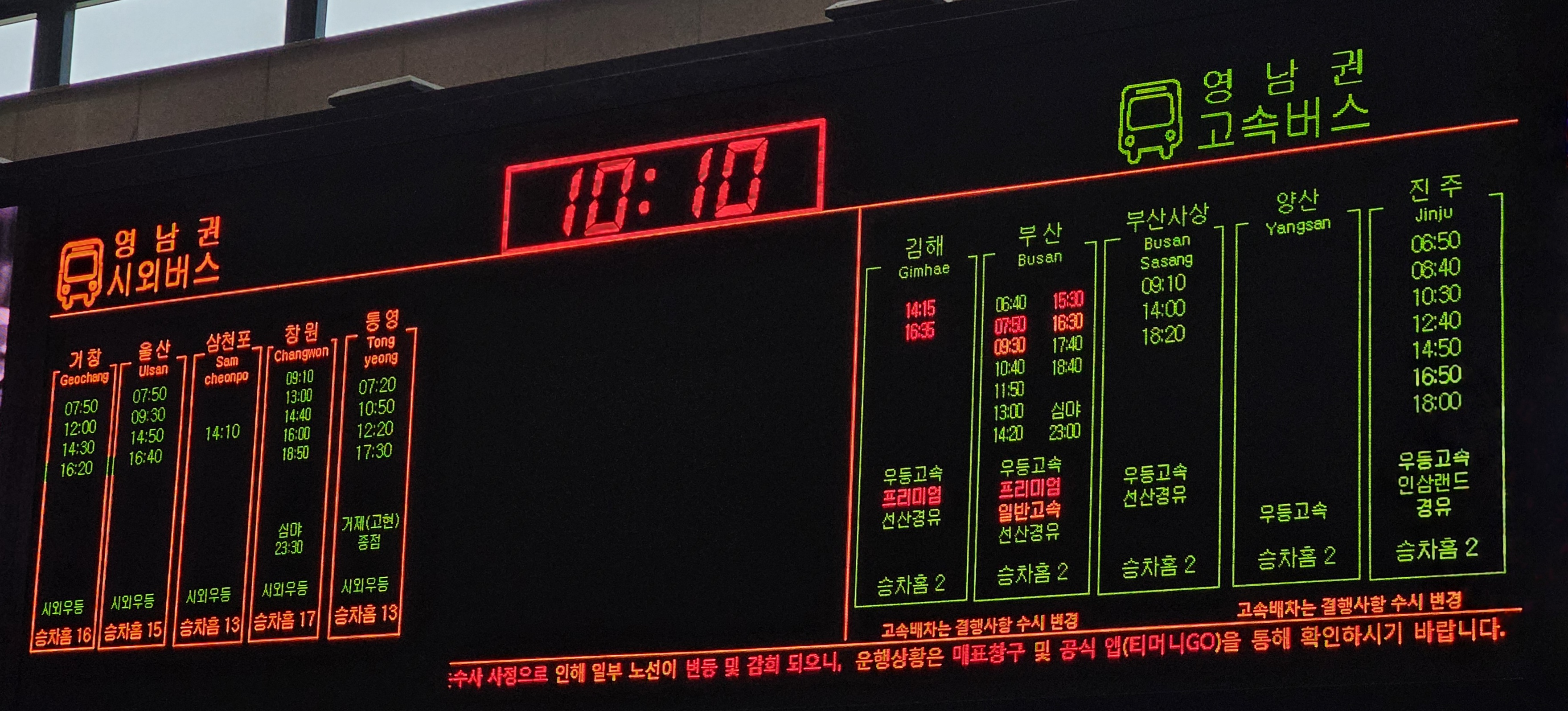 버스 시간표는 운수사 사정으로 일부 노선이 감회 및 변동이 있으나 매표창구난 공식앱인 '티머니GO'에서 시외버스와 고속버스 실시간 시간표 확인과 예매가 가능하다.