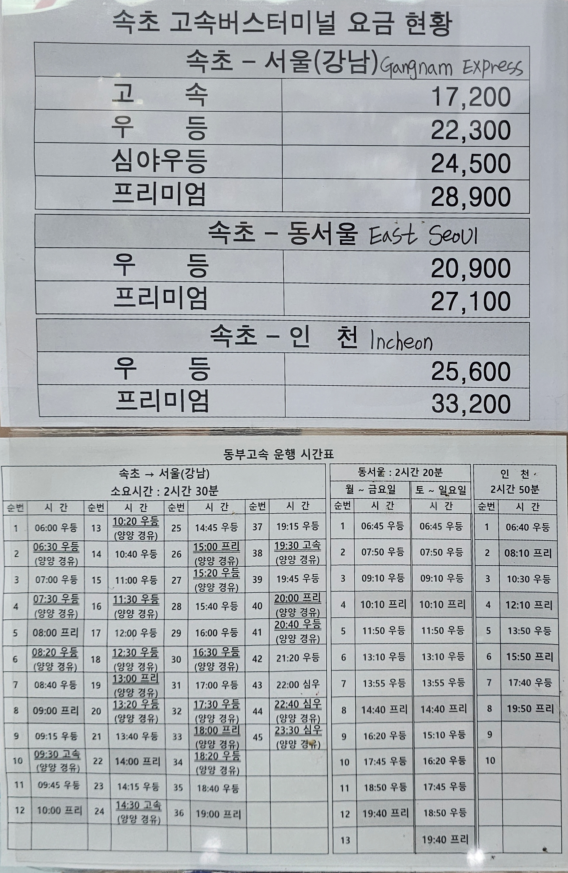 ▼속초고속버스터미널 버스 요금표 및 운행시간표