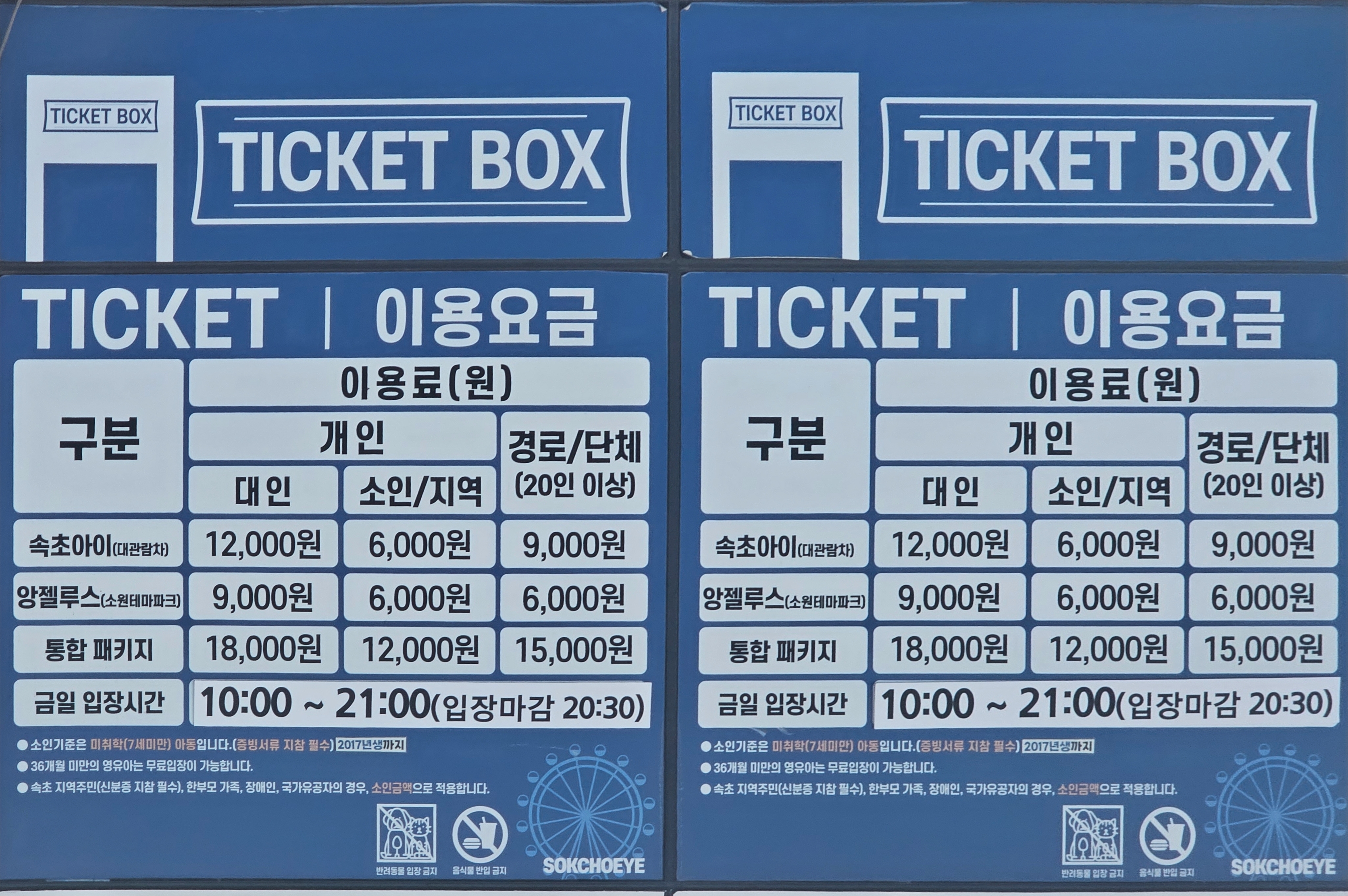 속초아이 이용요금은 대인이 12,000원이고 이용시간은 10시~21시까지 이용할 수 있는데 입장마감은 20시30분까지 입장하여야 이용할 수 있다.