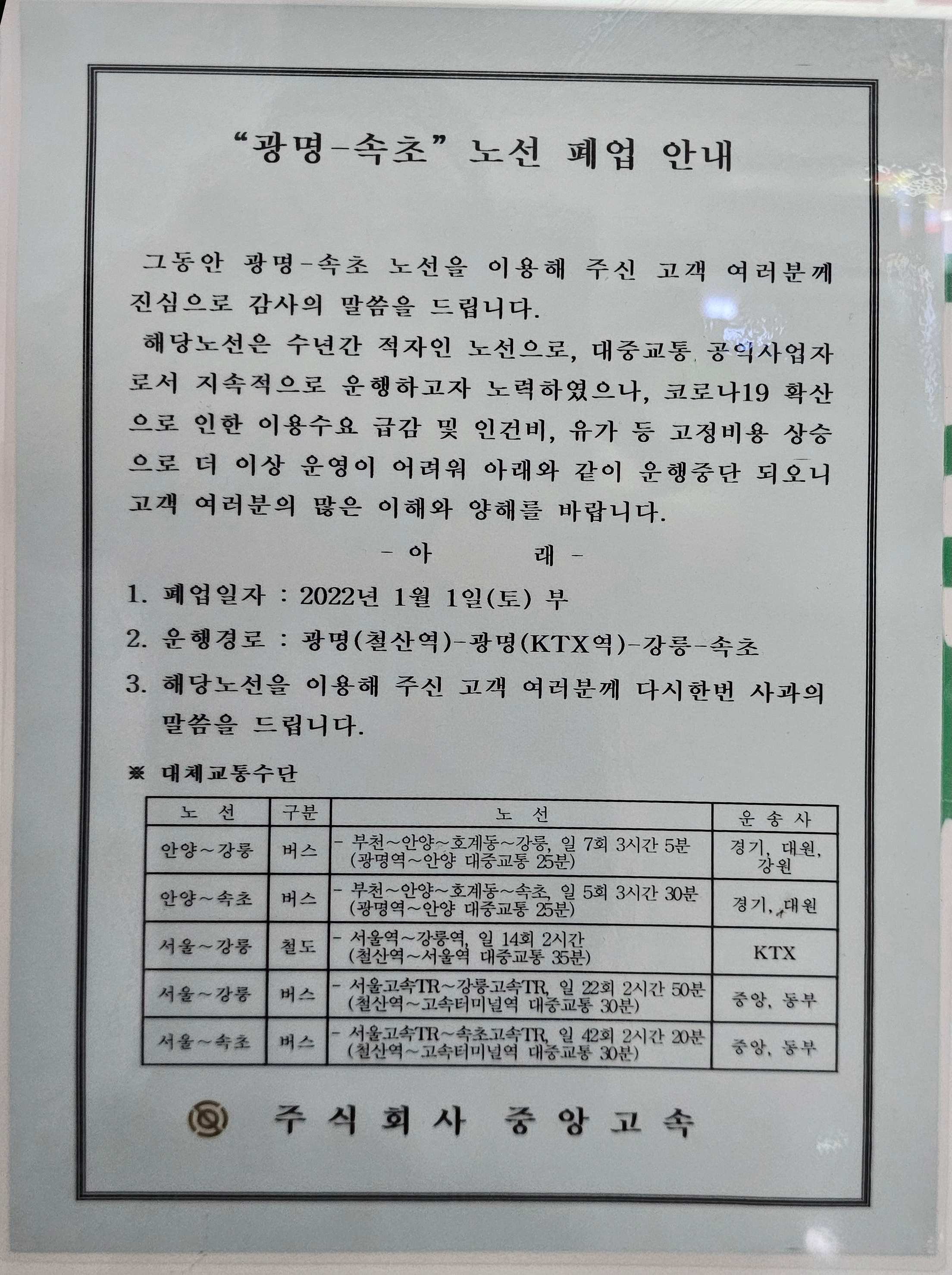속초고속버스터미널에서 동서울까지는 버스로 약 2시간20분이 소요된다.