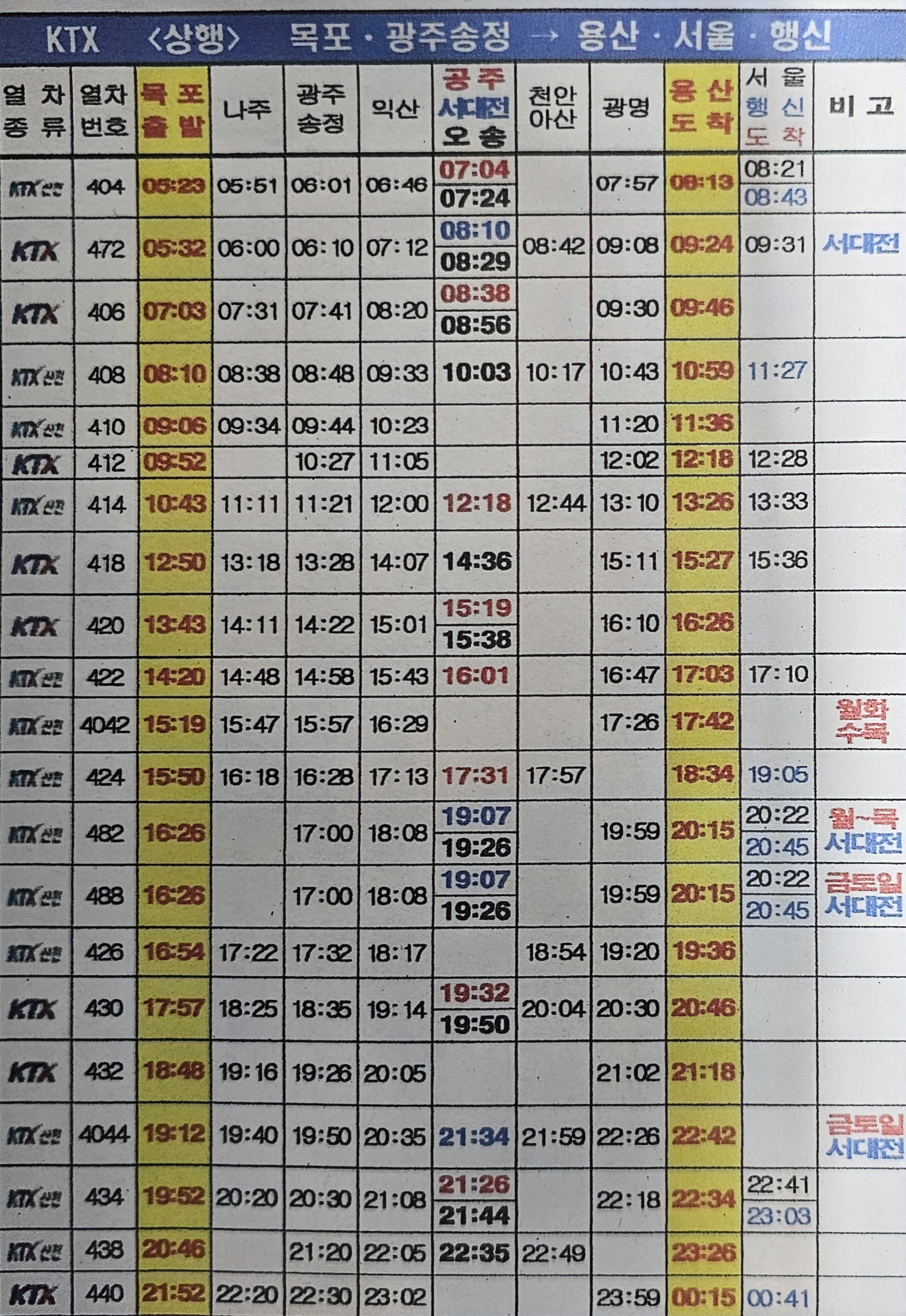 ▼하행선 KTX 시간표(행신역/서울역/용산역→목포역)