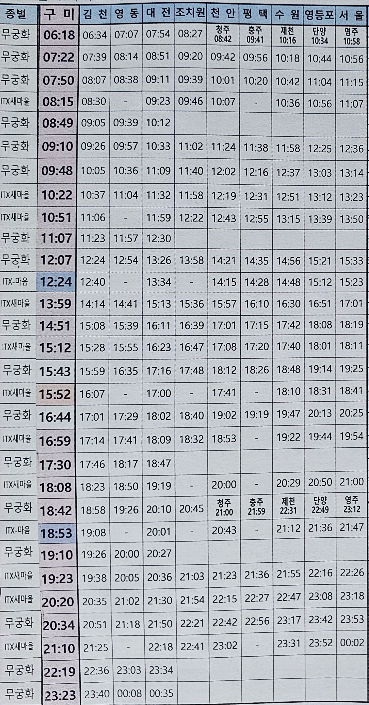 ■구미역 기차 시간표(2024년 1월12일 기준)