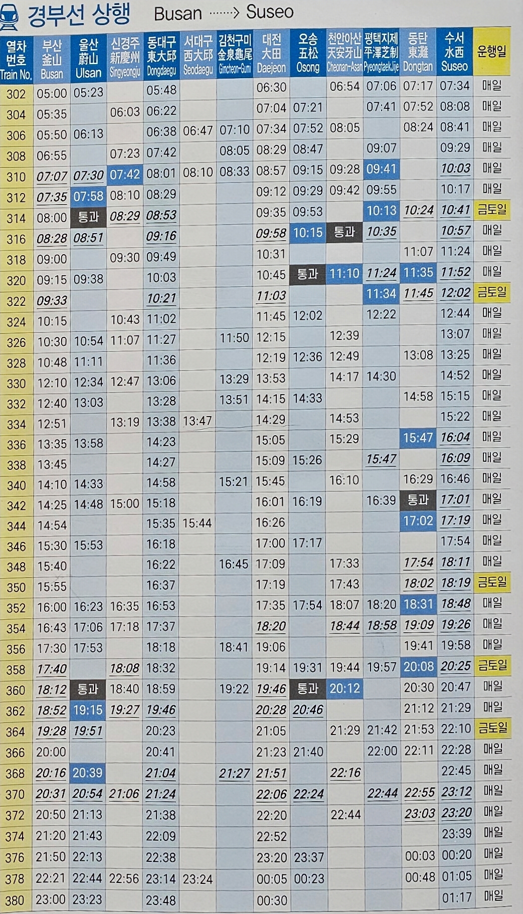 경부선 하행선 SRT 노선은 동대구역에서 신경주,울산을 경유하여 부산까지 운행하는 노선으로 동대구역에서 부산가는 SRT 첫차는 00시27분에 동대구역을 출발하여 부산역에는 01시07분에 도착한다.